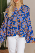 Blue Floral Print Batwing Sleeve Buttoned Loose Fit Shirt