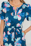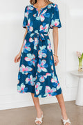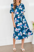 Blue Floral Print Short Puff Sleeve Ruffle Hem Belted Long Dress