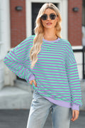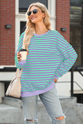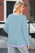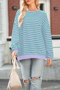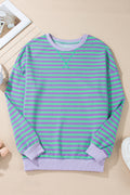 Blue Stripe Contrast Ribbed Trim Crossed Stitch Drop Shoulder Sweatshirt