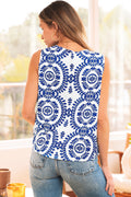 Blue Vintage Print Pintuck Crew Neck Tank Top