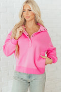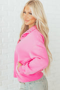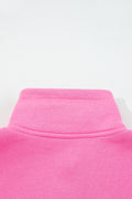 Bright Pink Half Button Stand Neck Drop Shoulder Sweatshirt