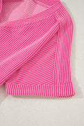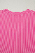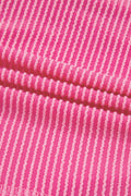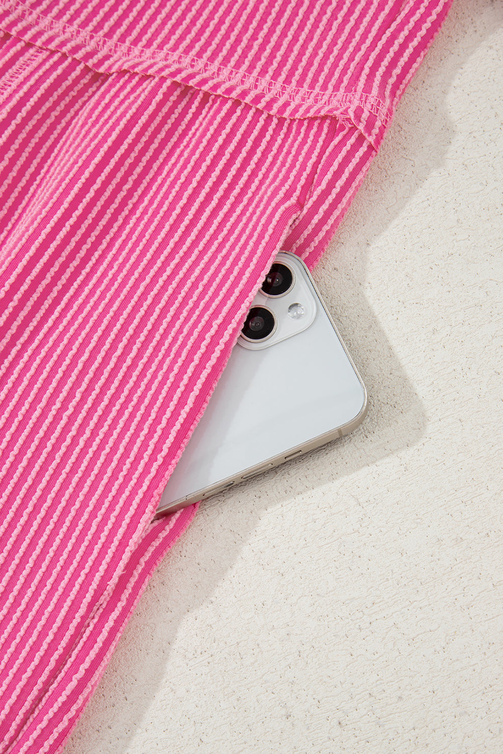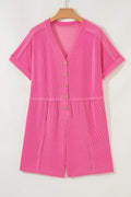 Sale Bright Pink Spiral Ribbed Short Sleeve V Neck Buttoned Romper with Pocket