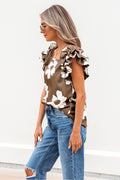 Sale Brown Floral Textured Ruffled Short Sleeve Square Neck Blouse