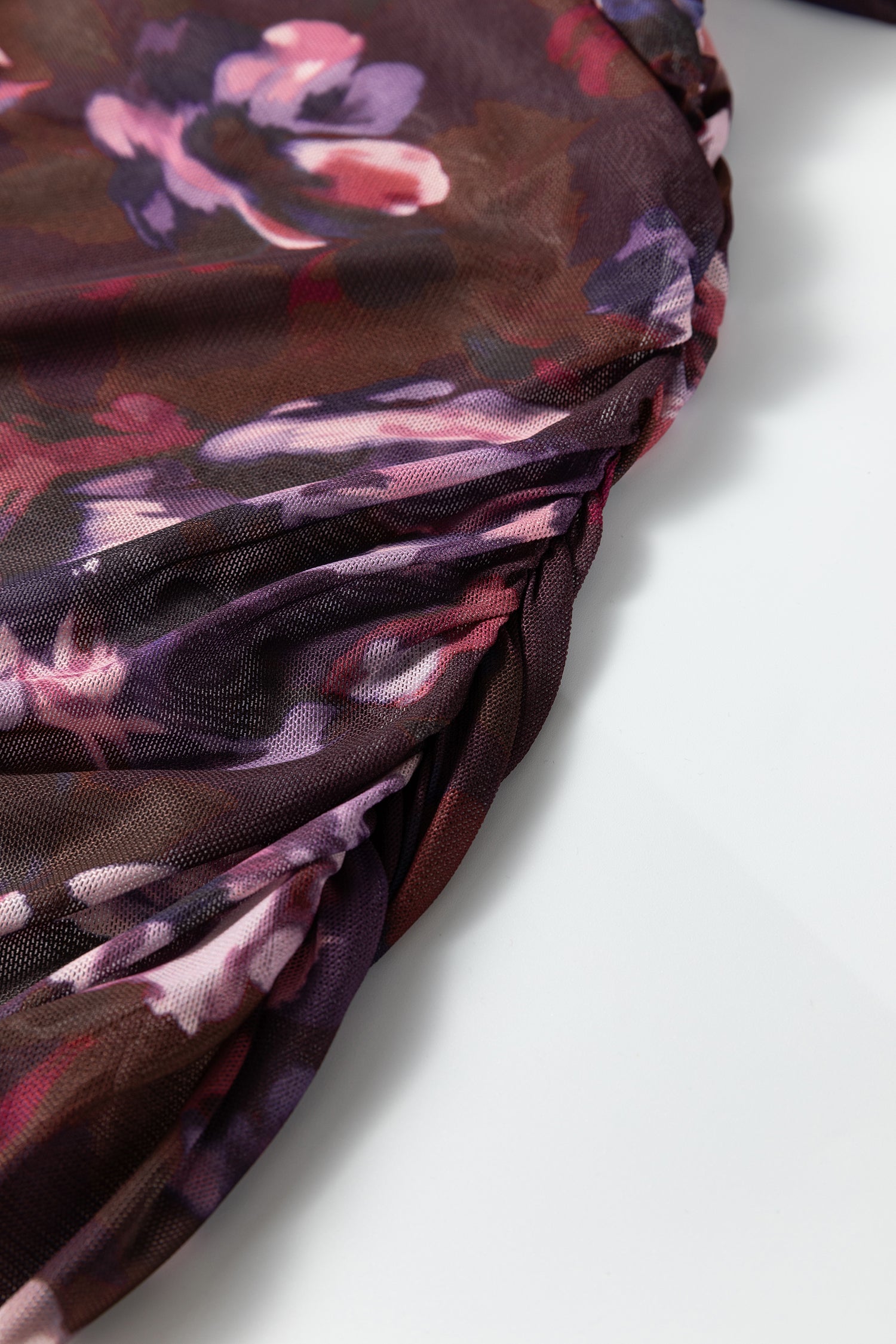 - High neck mesh top delivers a chic, elevated look for day or night.The ruched design adds soft texture with a flattering fitted silhouette.Lightweight mesh top offers breathable comfort for layered outfits.Floral print brings feminine detail with modern appeal.