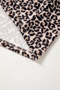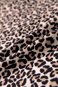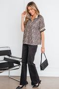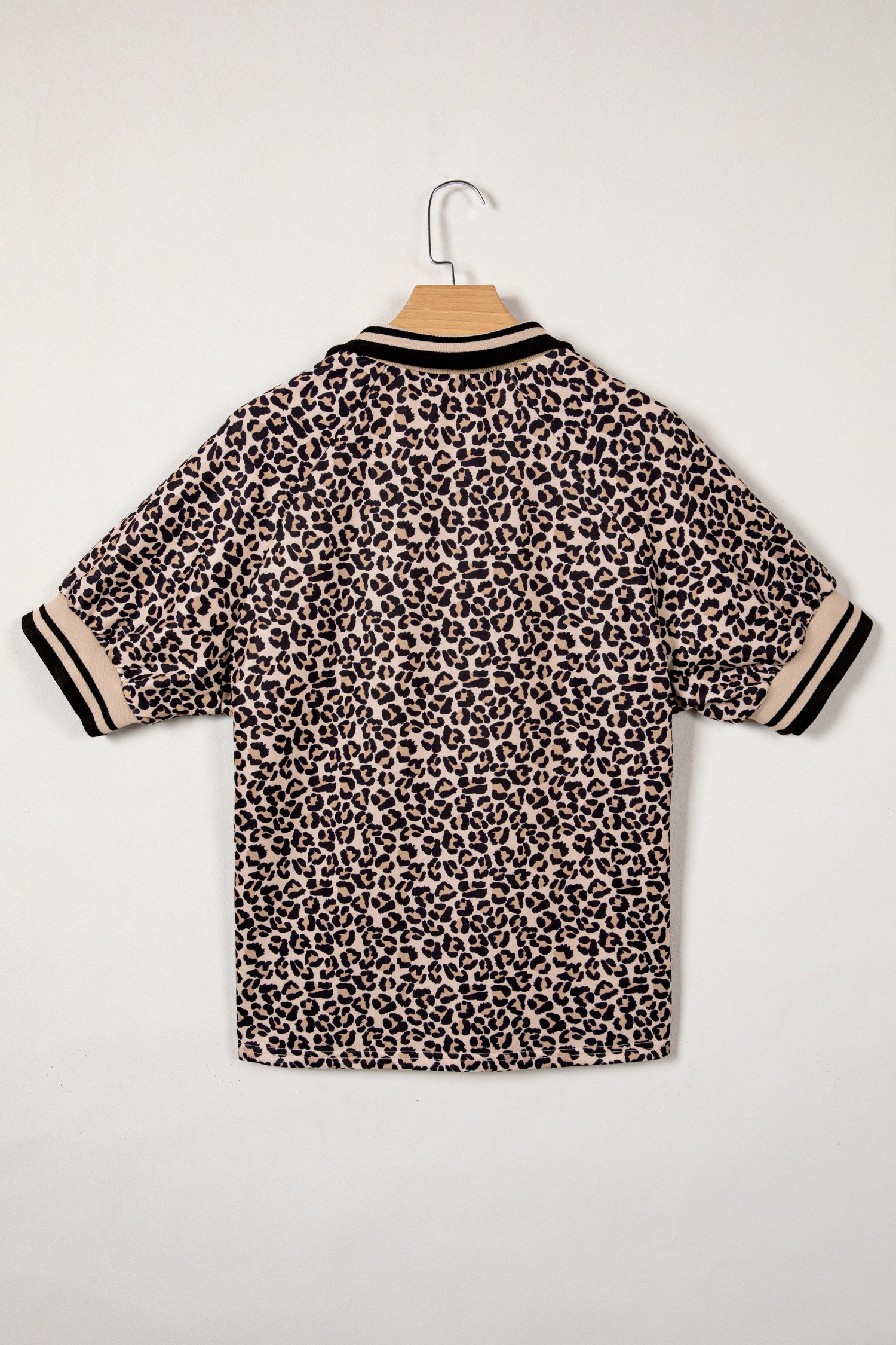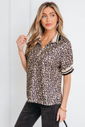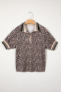 Brown Leopard Print Half Zip Striped Trim Patchwork Short Sleeve Top