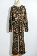 Brown Leopard Print Raw Seam Patchwork Pullover Drawstring Loose Pant Set
