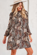 Brown Leopard Ruffled Detail Long Sleeve Loose Mini Dress