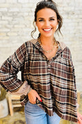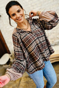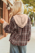 Brown Plaid Patchwork Long Sleeve Button Hooded Blouse