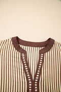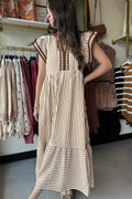 Brown Stripe Double Ruffled Short Sleeve Contrast Trim V Neck Midi Dress