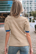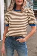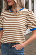 Brown Stripe Short Puff Sleeve Contrast Trim Round Neck Tee