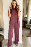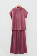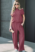 Burgundy Twisted Ribbed High Neck Loose Tee Elastic High Waist Loose Pant Set