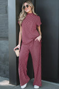 - The twisted rib fabric makes this pant set textured and fashionable.This 2 piece pants outfit includes a casual tee and high waist wide leg pants.Mock neck short sleeve tee in a loose fit design while the casual pants draped naturally.The high neck tee and matching pants can be worn separately for personal styles.
