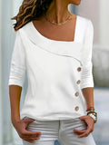 Button Detail Asymmetrical Neck T-shirt, Versatile Long Sleeve Top