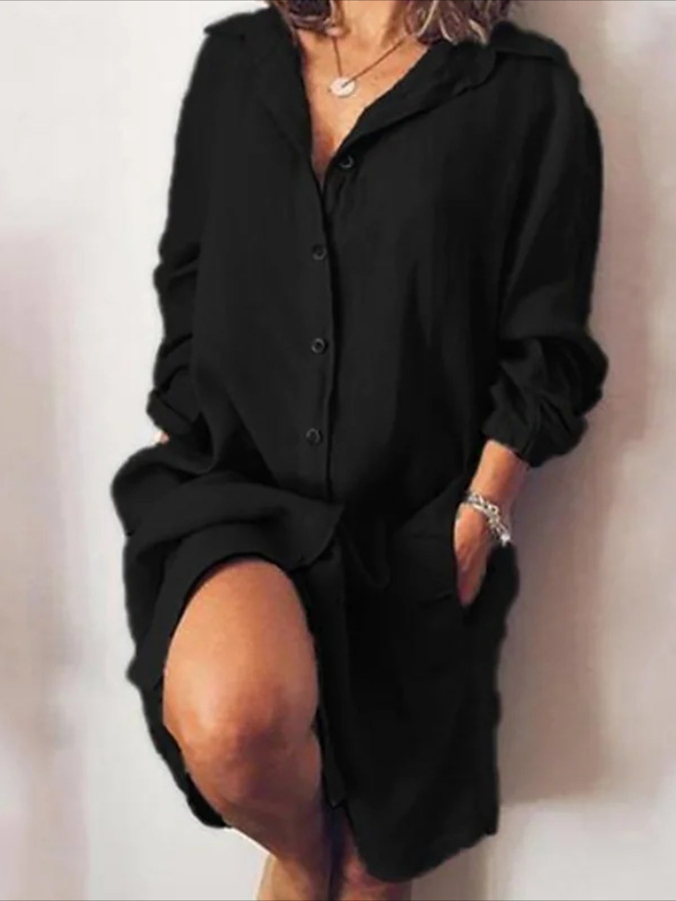Sale Button Front Solid Shirt Dress, Casual Long Sleeve Long Length Dress