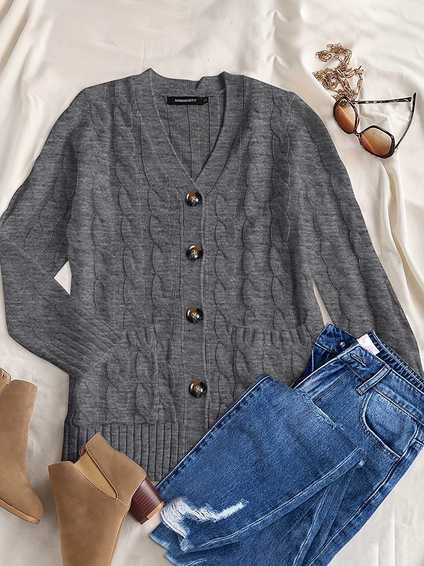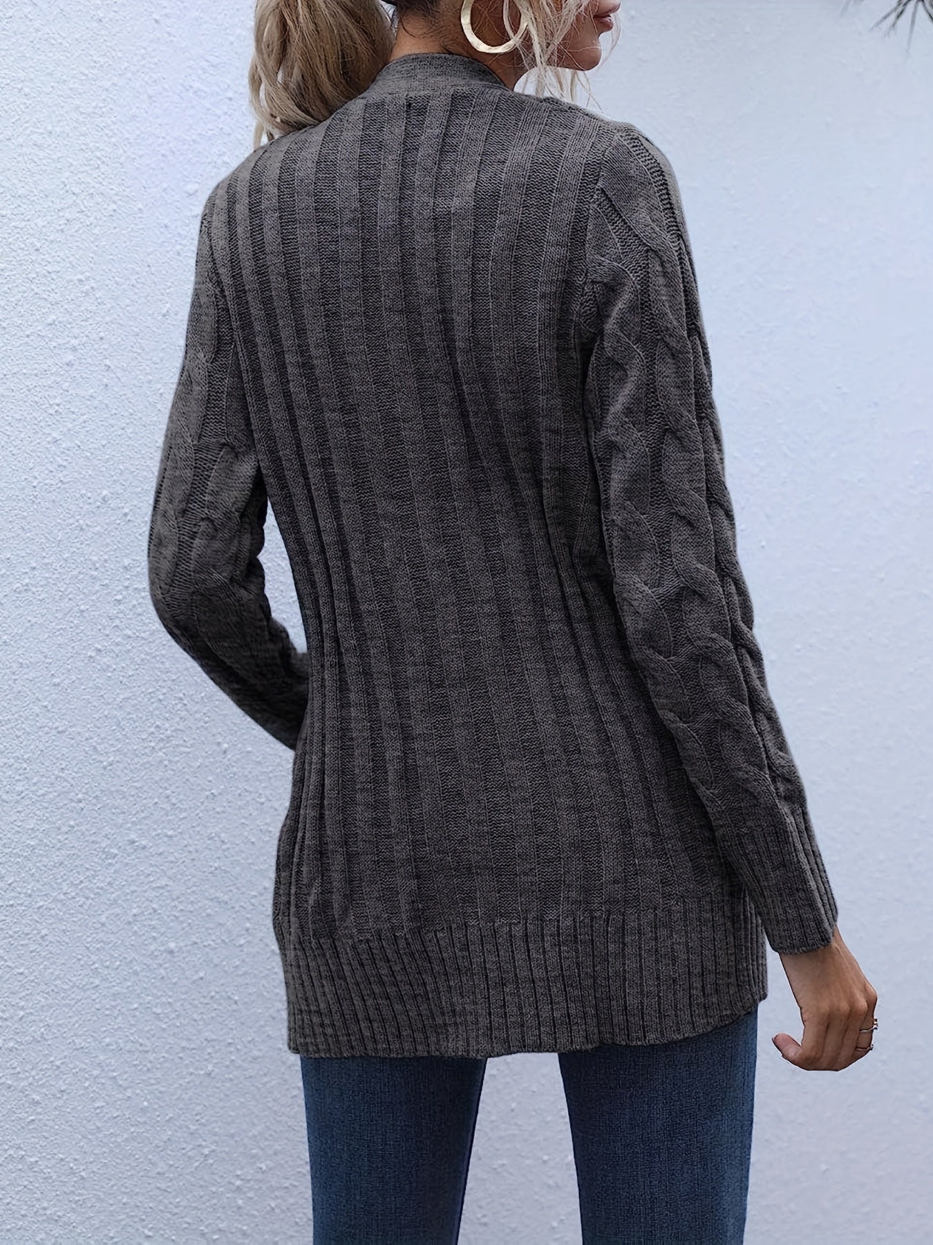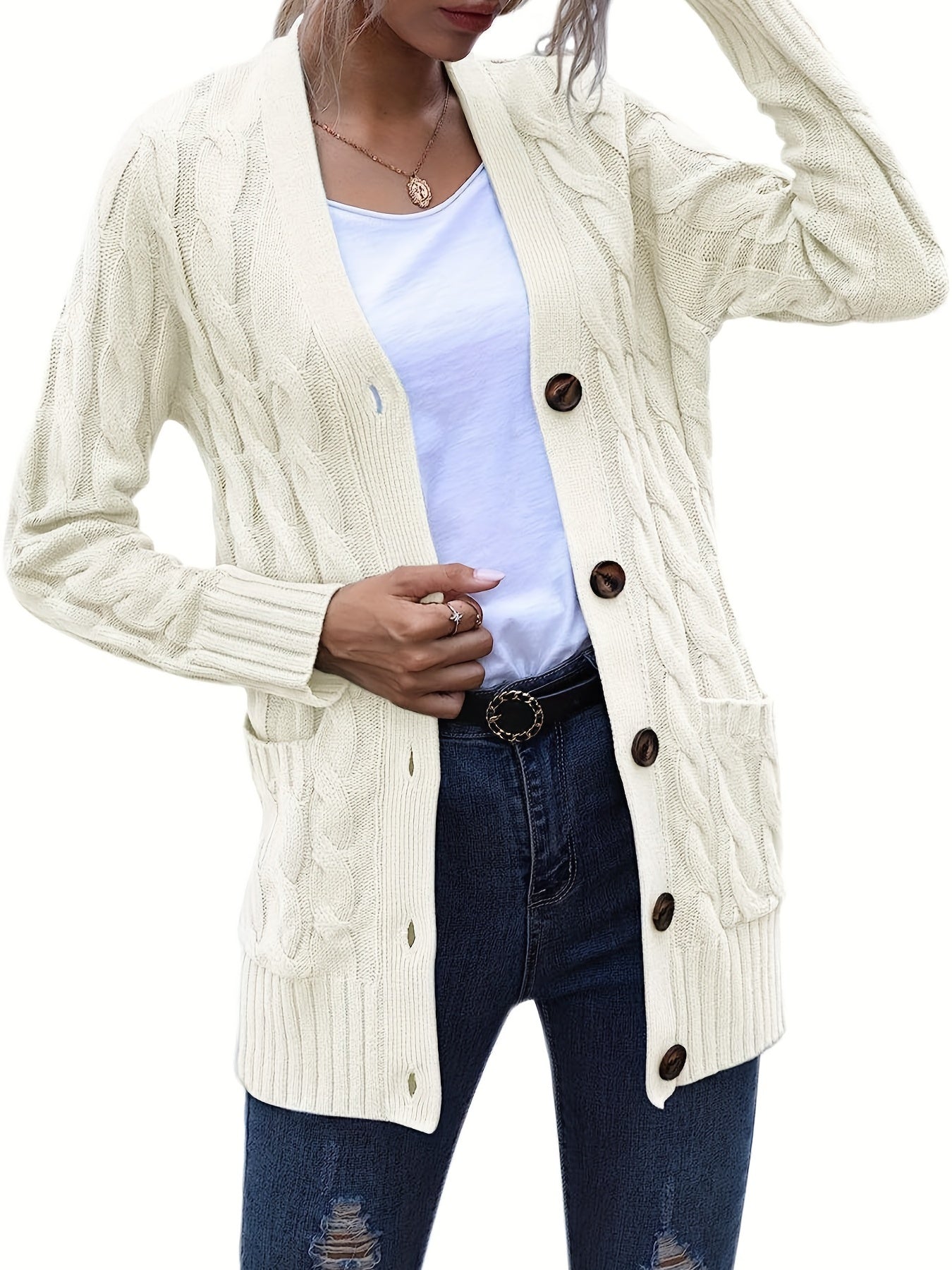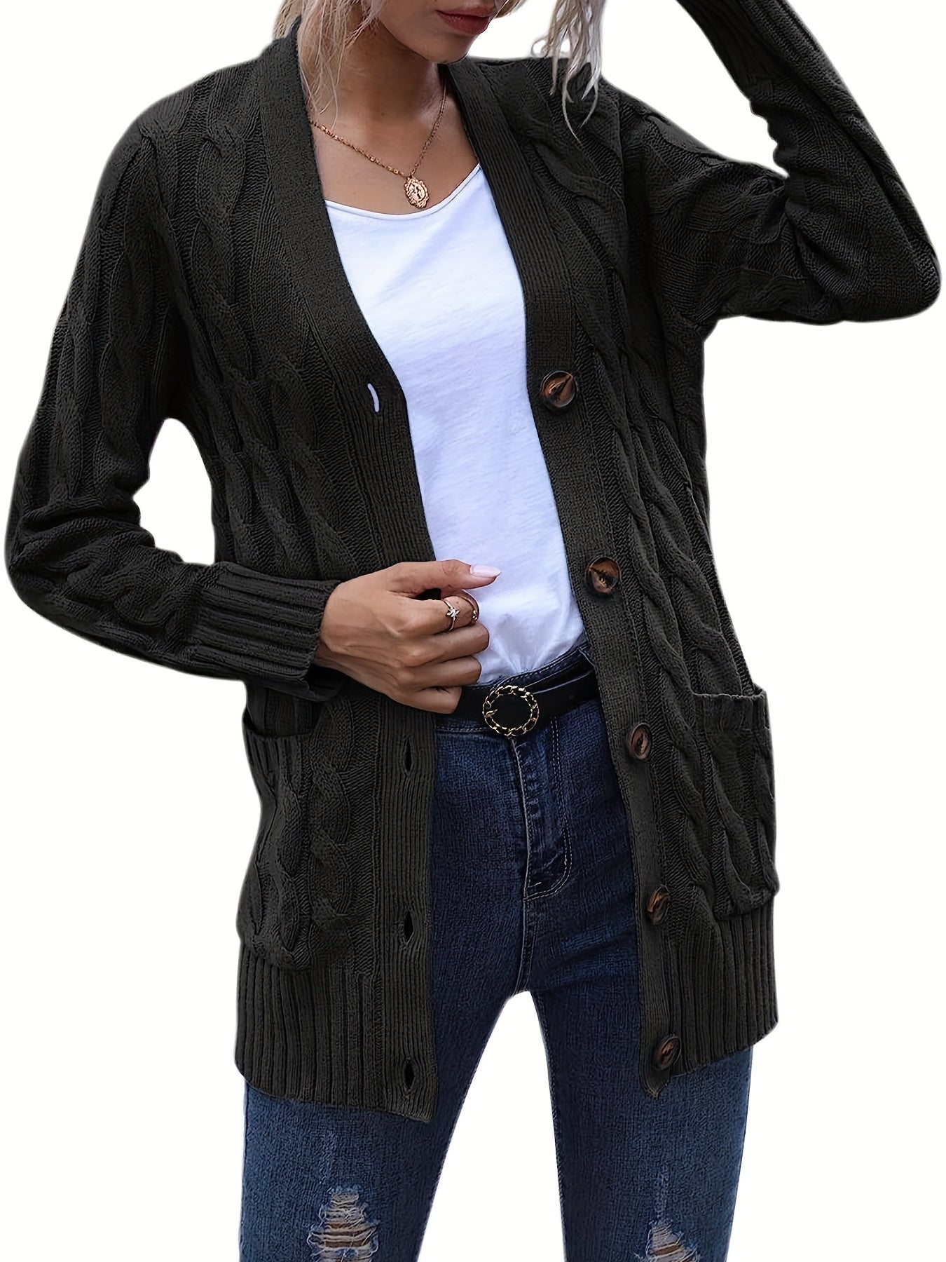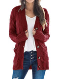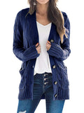 Sale Cable Knit Button Front Cardigan, Casual Solid Long Sleeve Cardigan