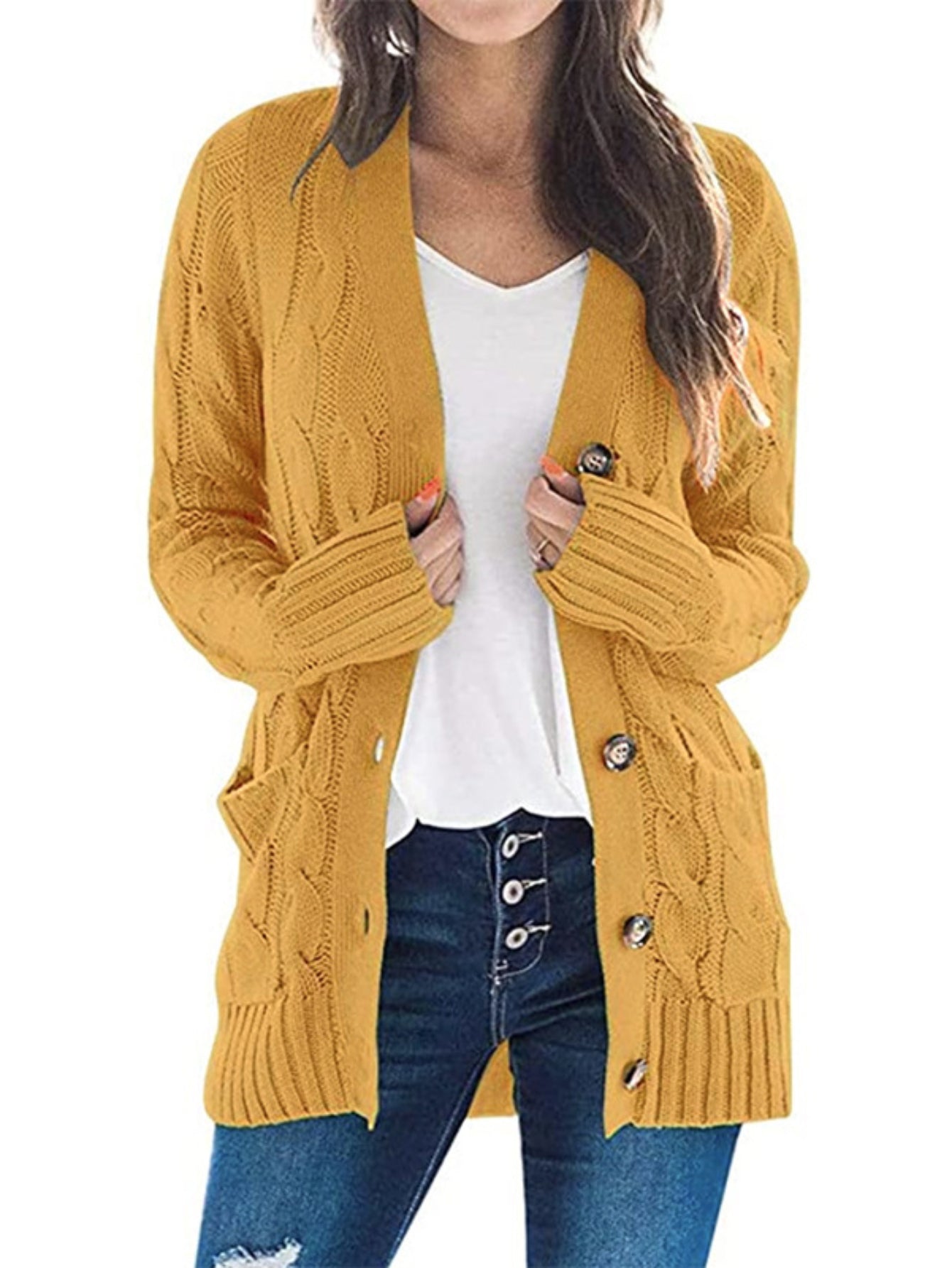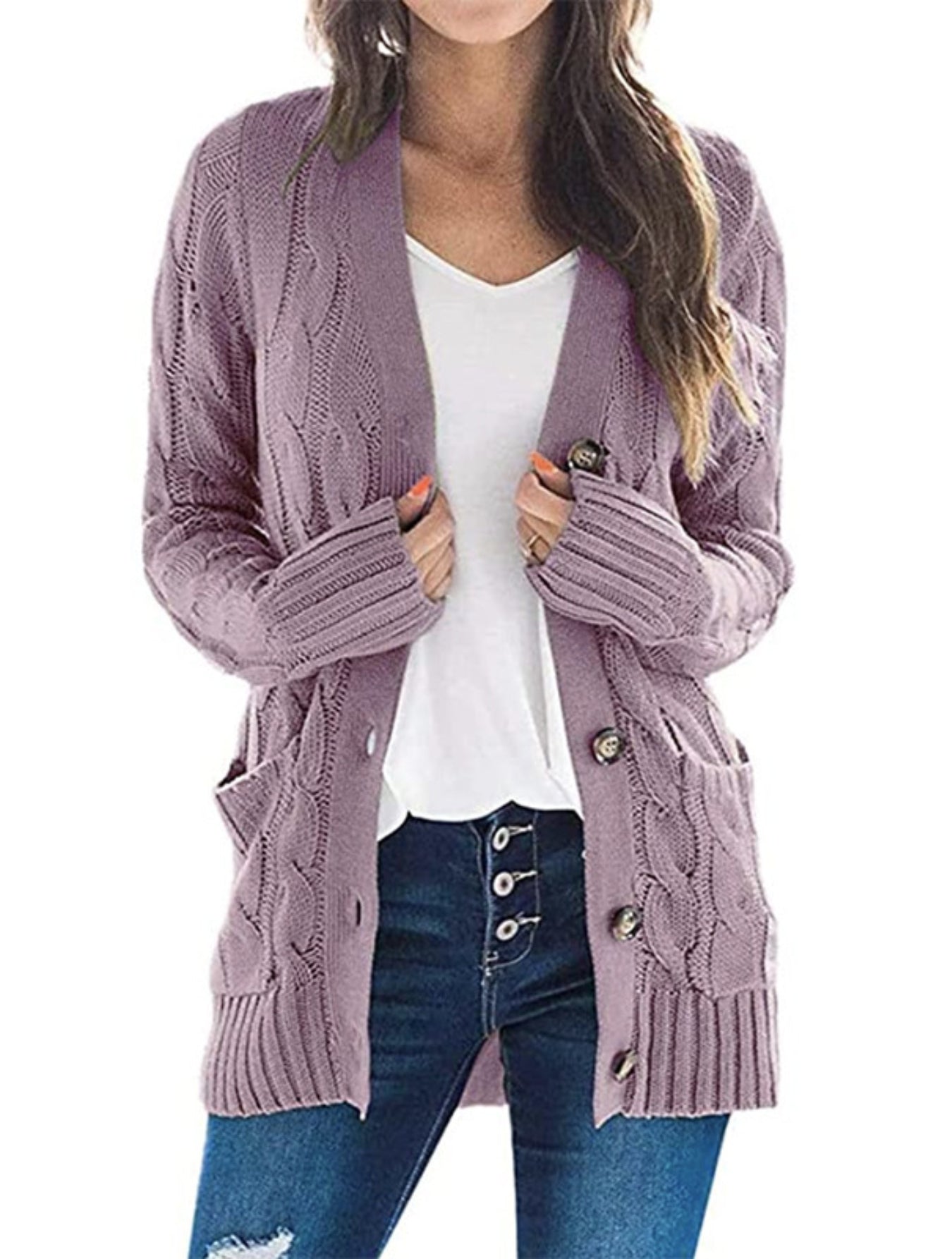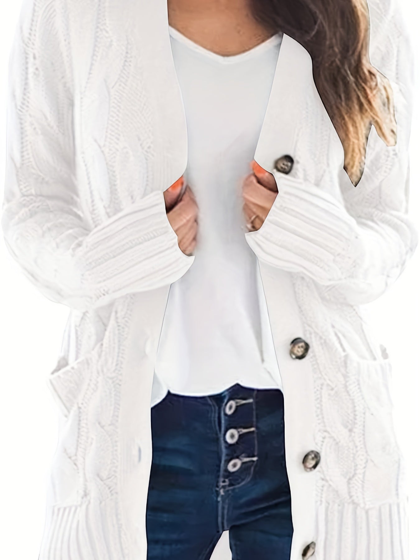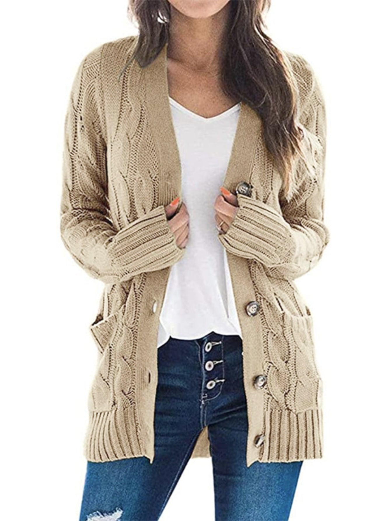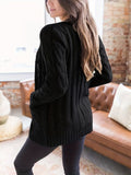 Sale Cable Knit Button Front Cardigan, Casual Solid Long Sleeve Cardigan