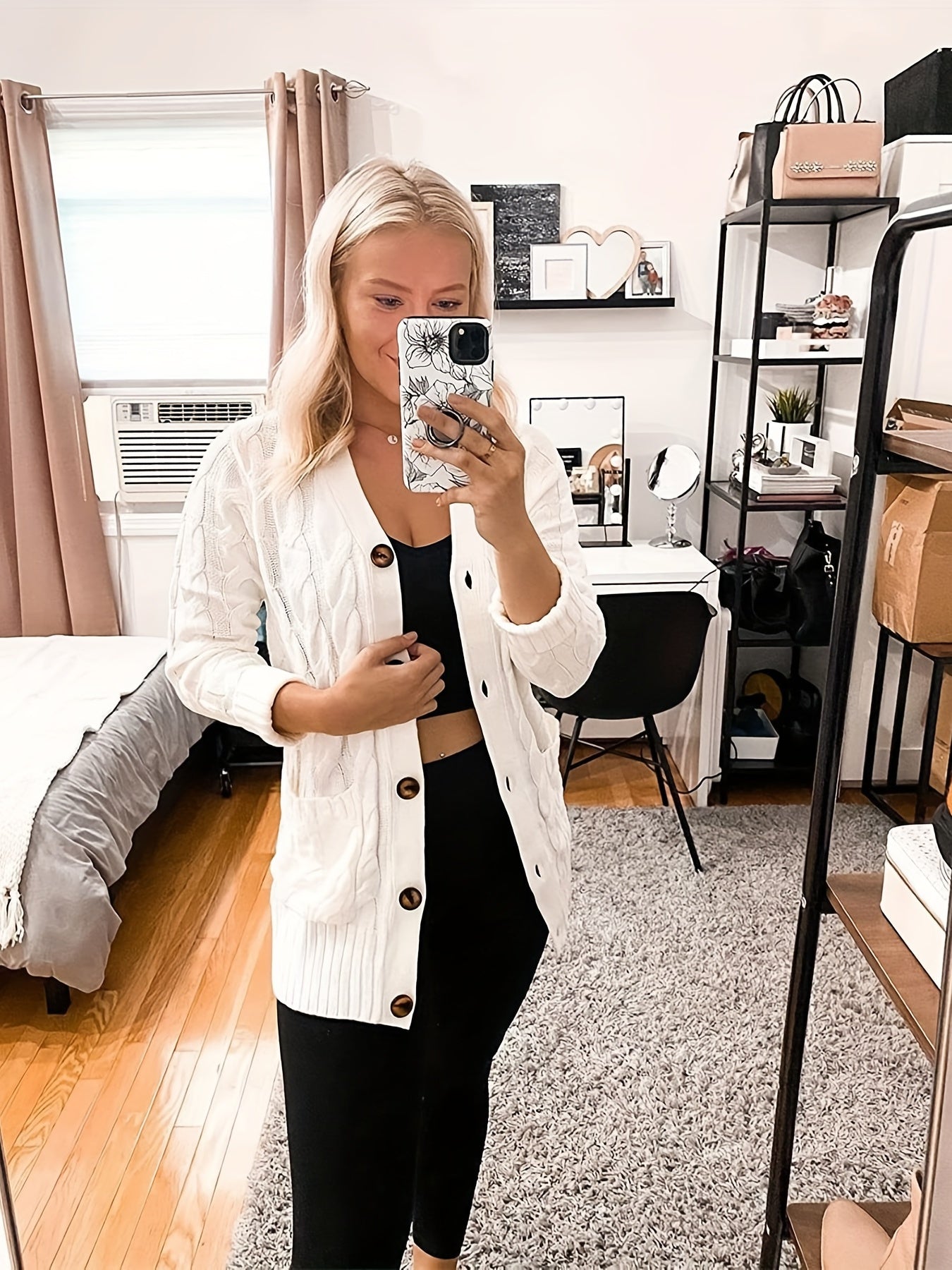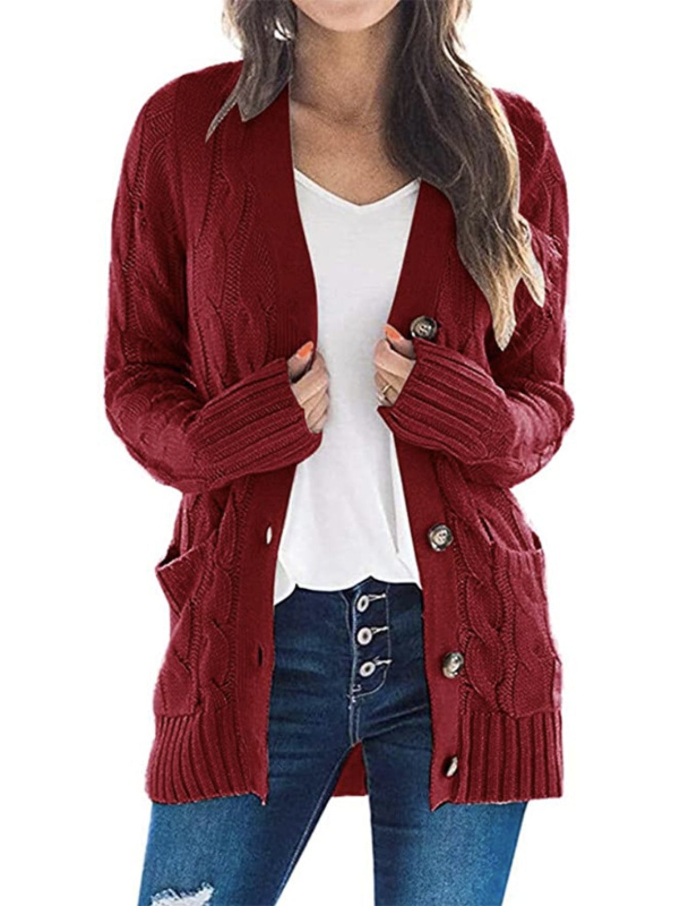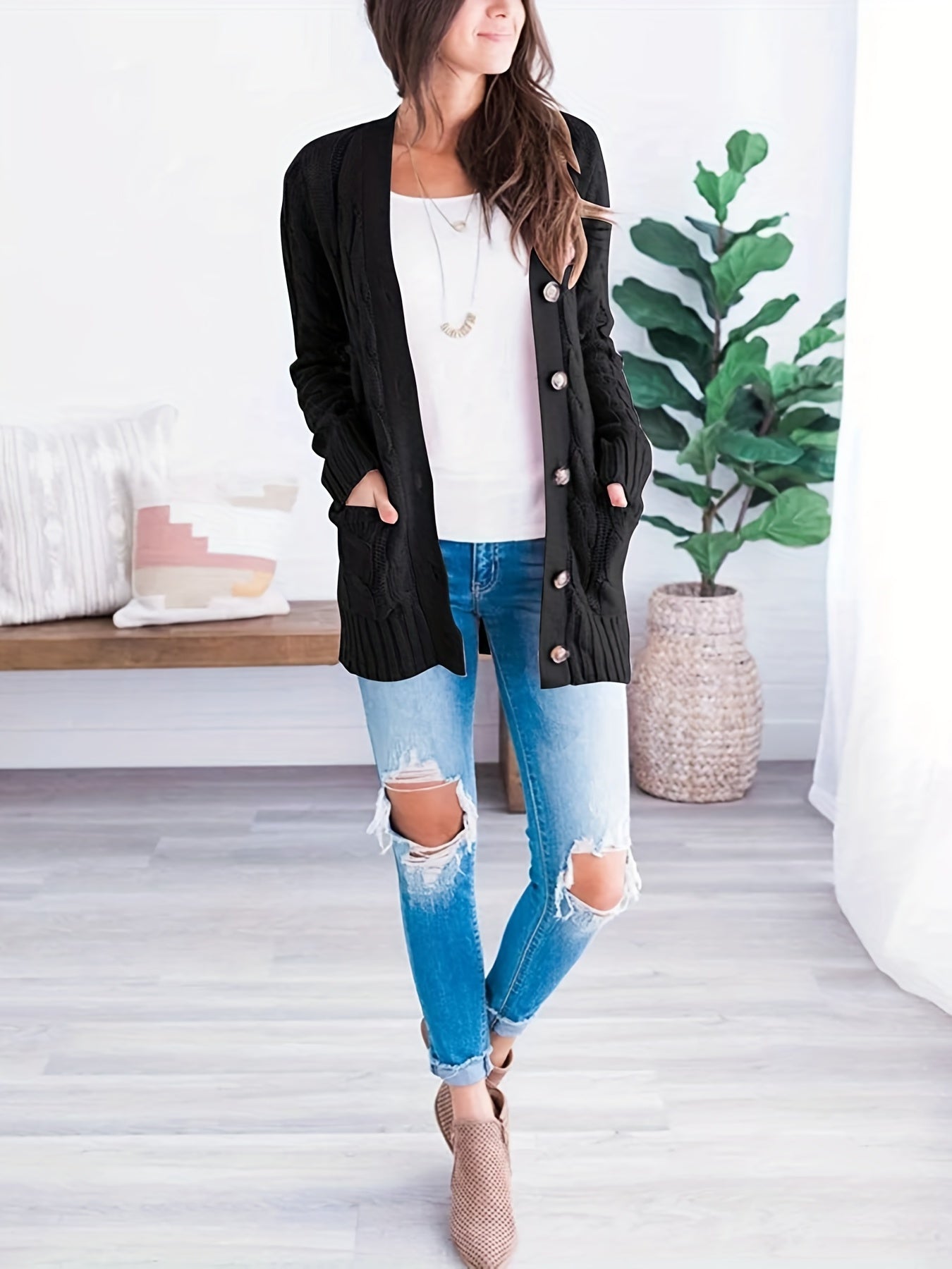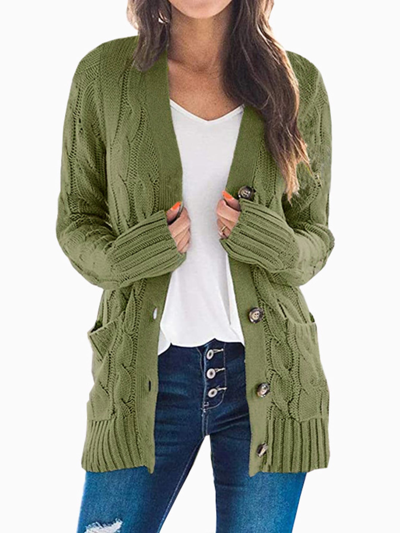Sale Cable Knit Button Front Cardigan, Casual Solid Long Sleeve Cardigan