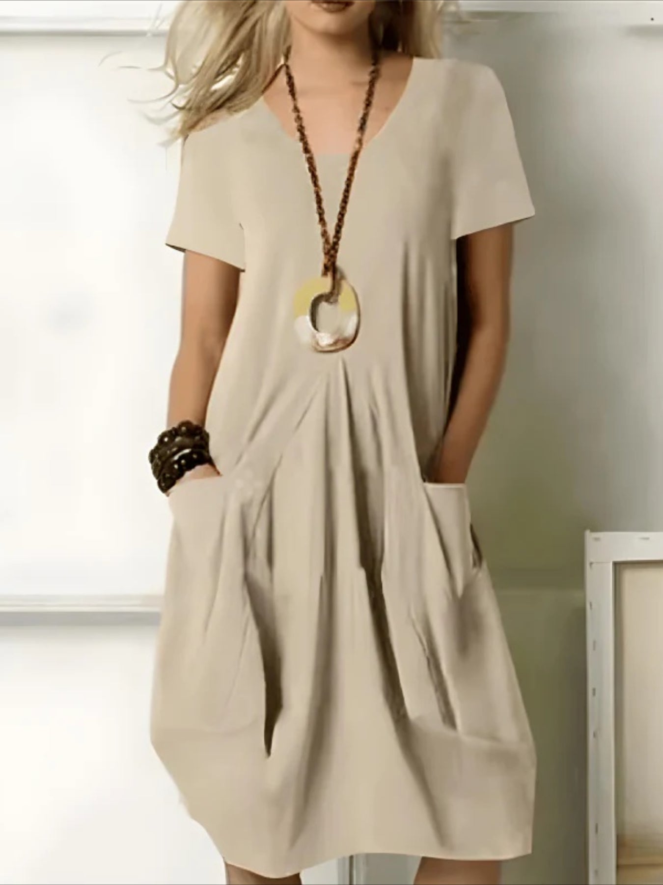 Casual Cotton and Linen Pocket Solid Color Midi Dress