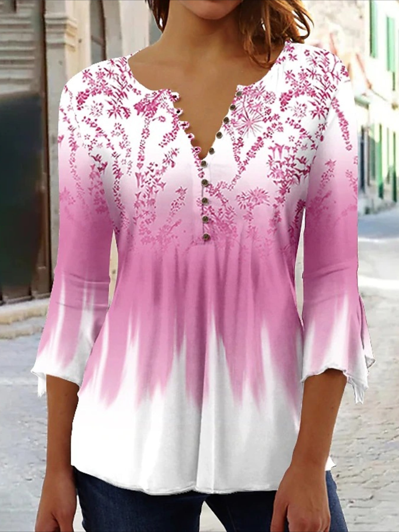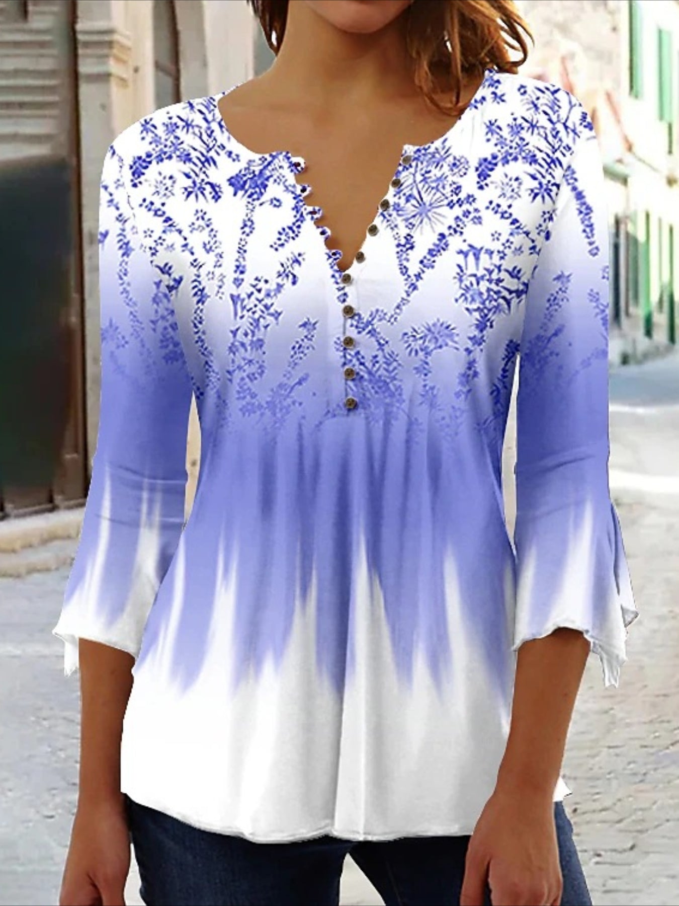 Sale Casual Floral Print V-Neck 3/4 Sleeves Blouse