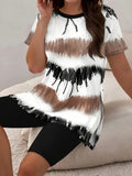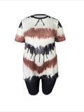 Casual Two-Piece Set Color Block Print Short Sleeve Top With Side Slit & High-Waisted Shorts