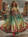 Christmas Pleated Party Long Sleeve V Neck Maxi Dress