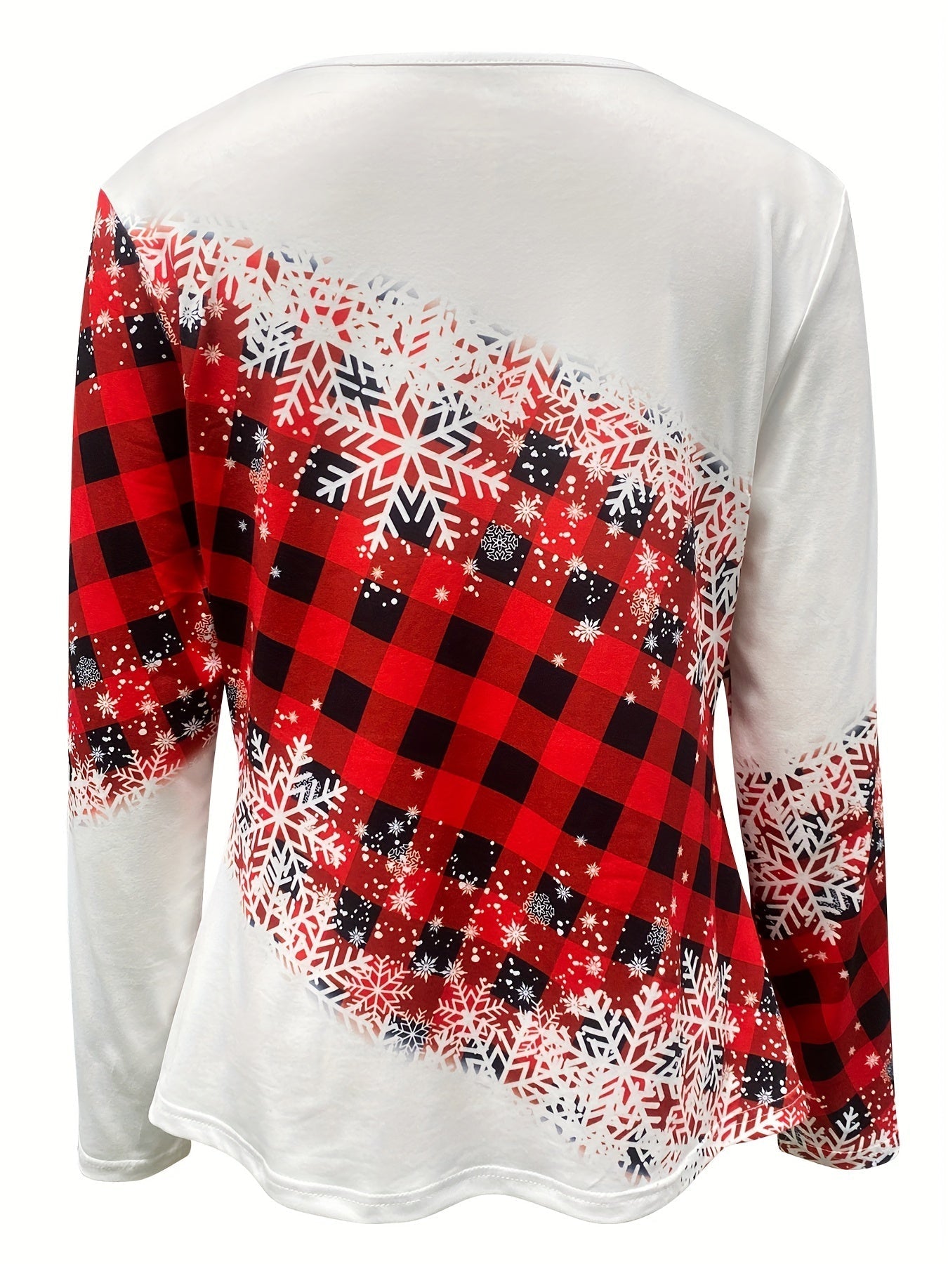Christmas Snowflake Print Button Decor T-shirt, Casual Long Sleeve Plaid Print T-shirt