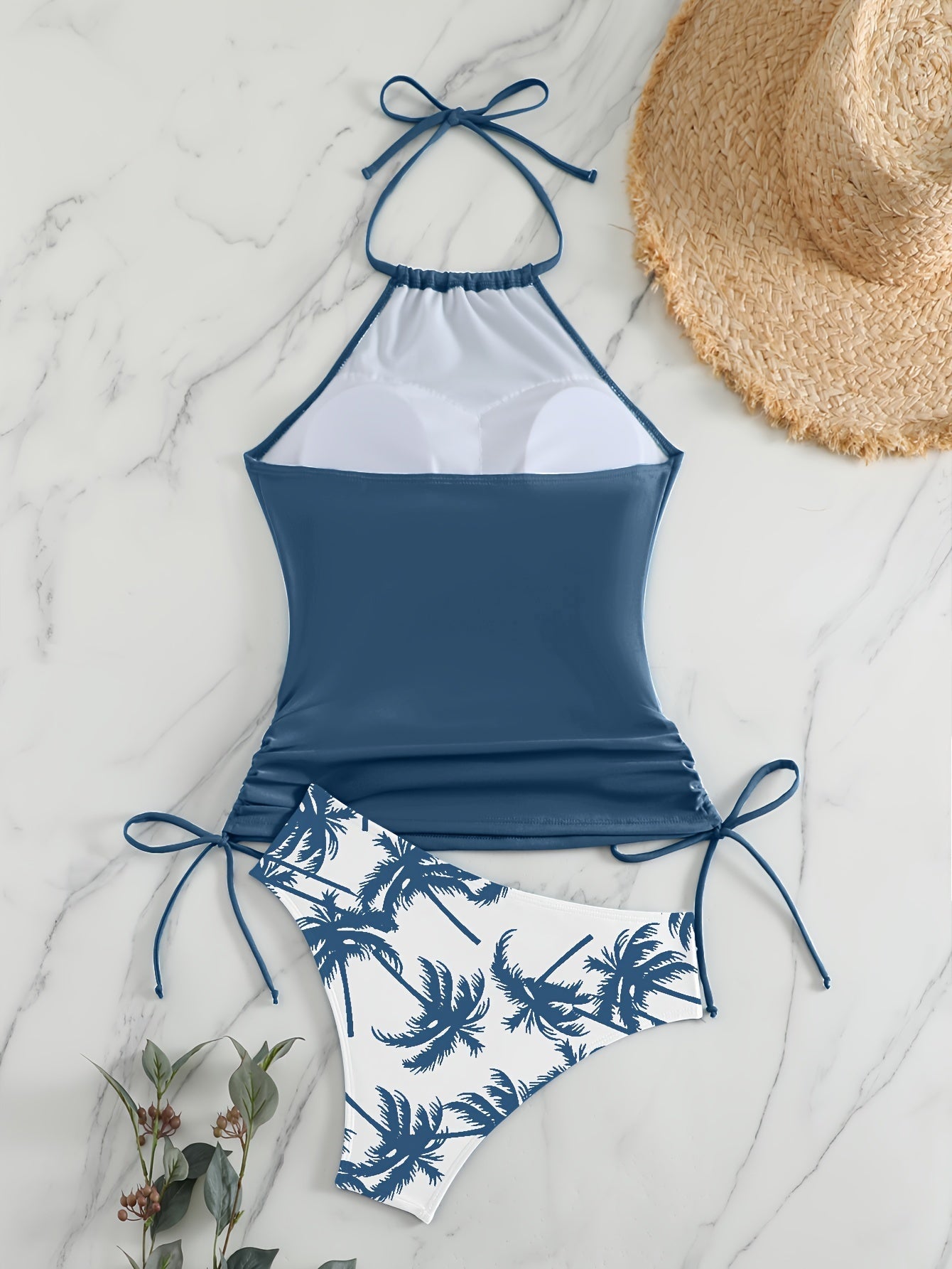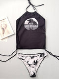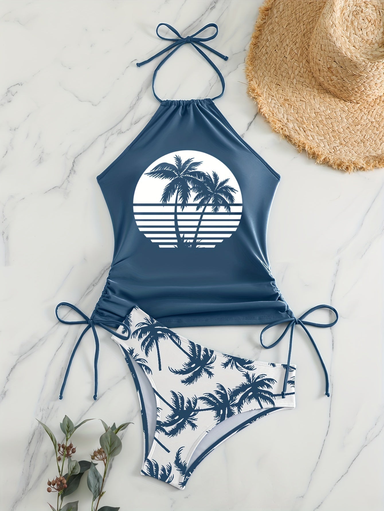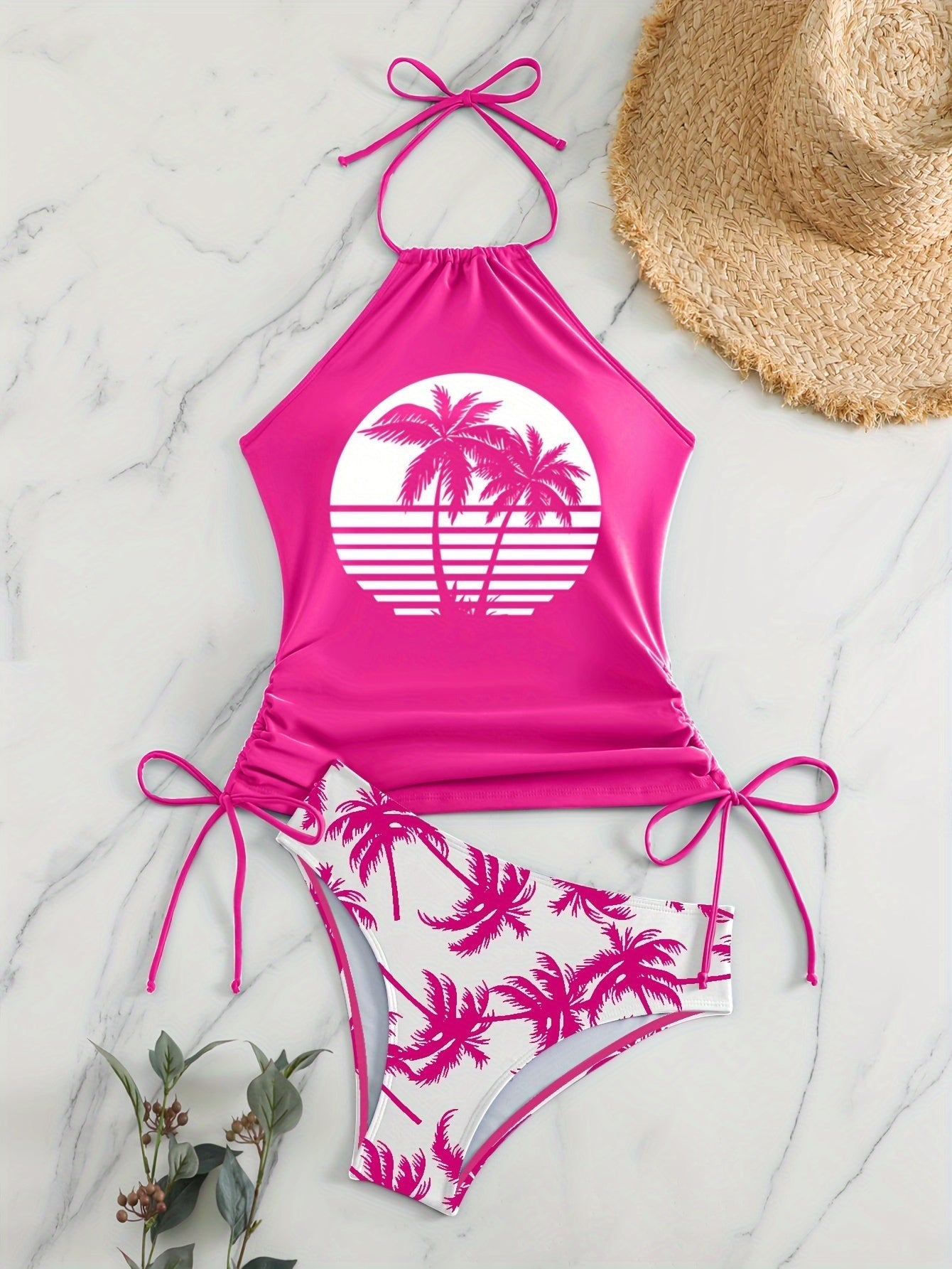 Coconut Tree Sunset Pattern Drawstring 2 Piece Set Swimsuit, Halter Tie Neck Backless Stretchy Low Waist Bathing Suit