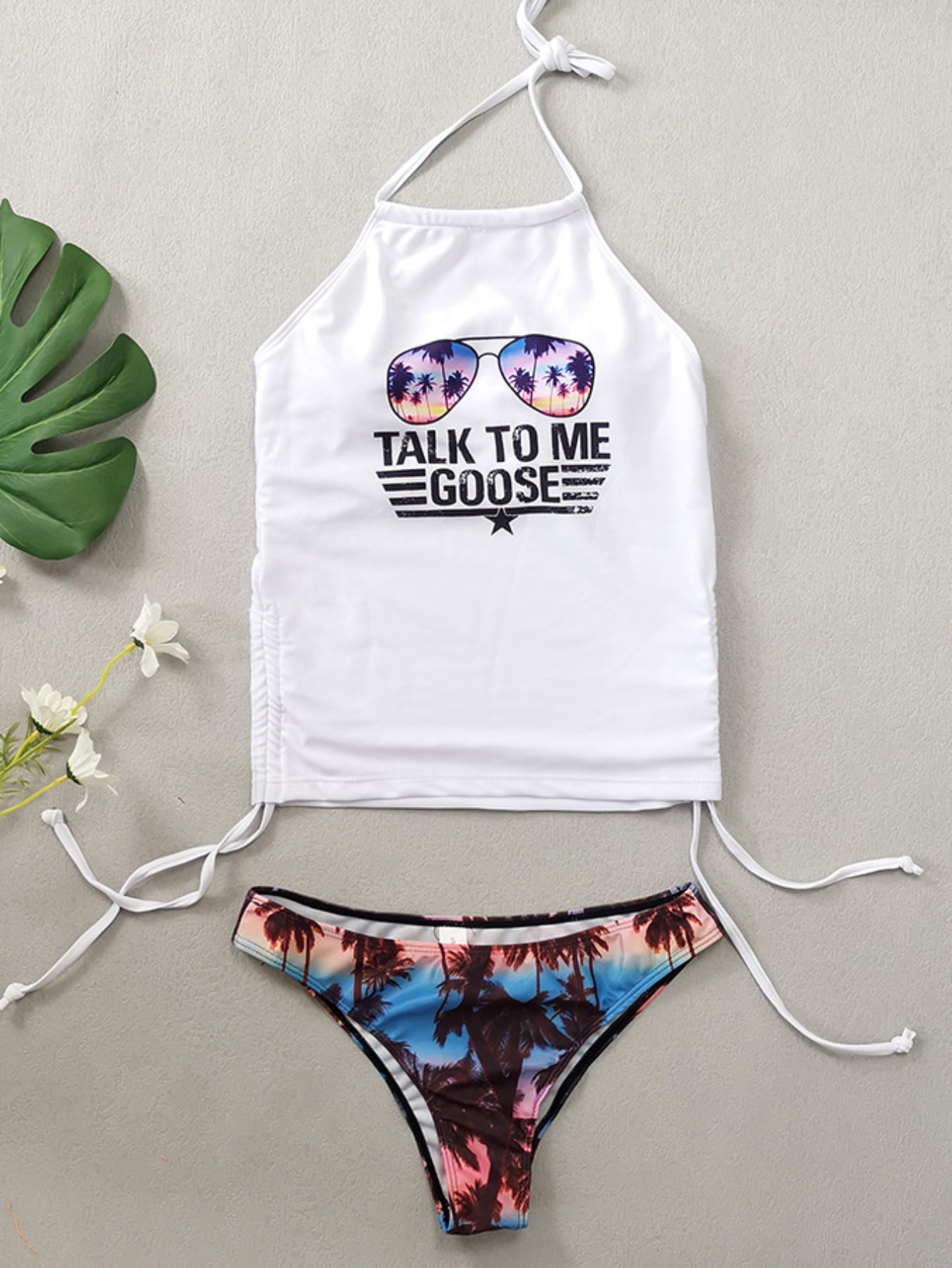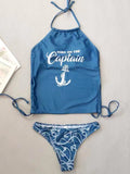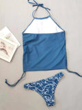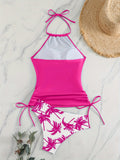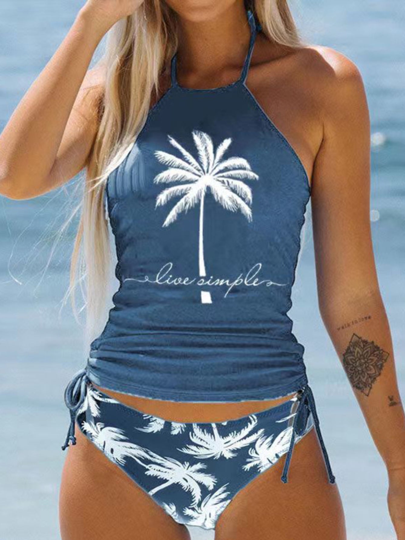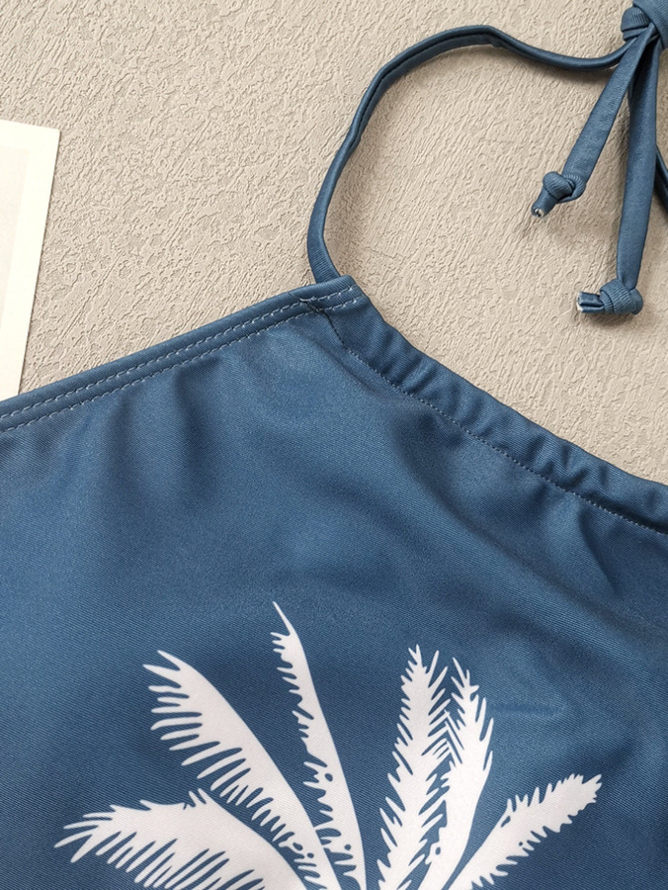 Coconut Tree Sunset Pattern Drawstring 2 Piece Set Swimsuit, Halter Tie Neck Backless Stretchy Low Waist Bathing Suit
