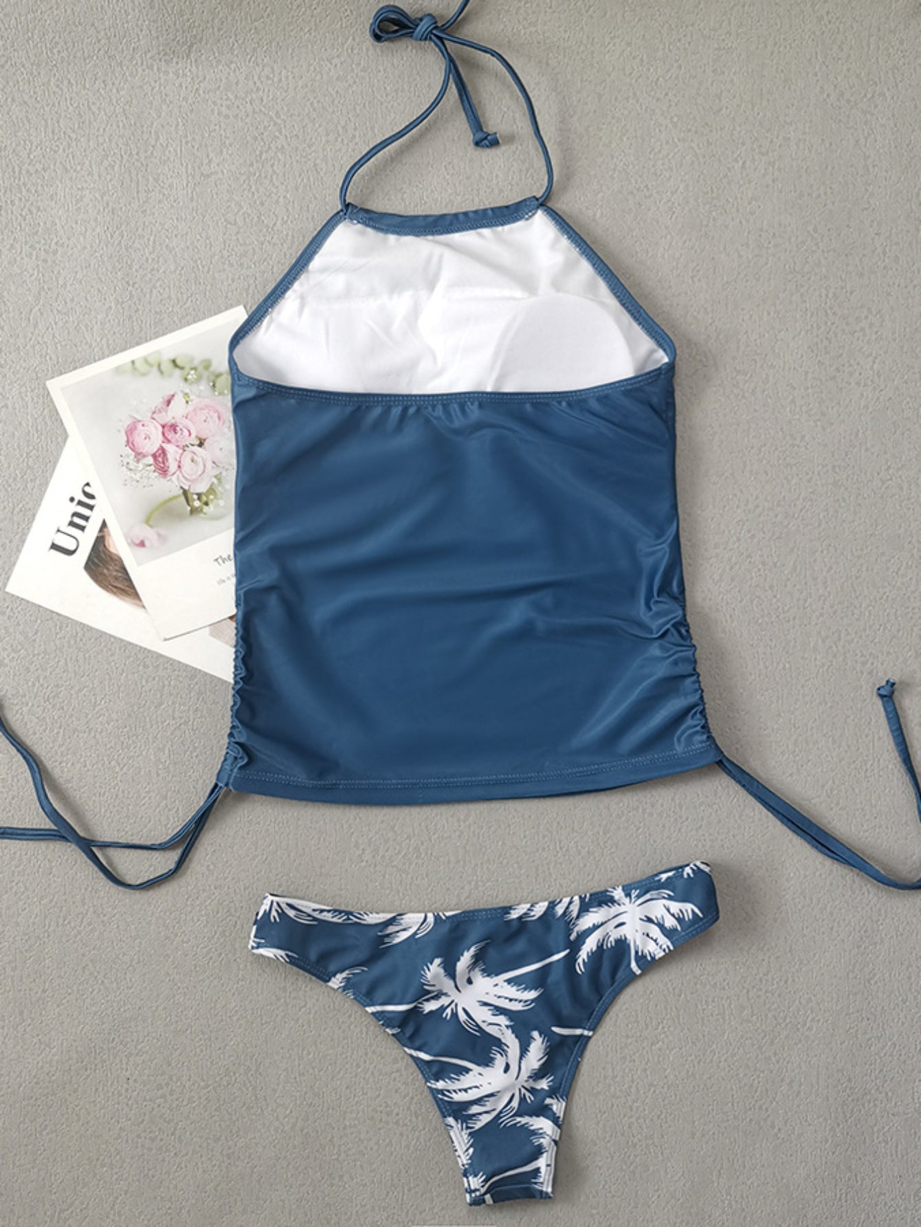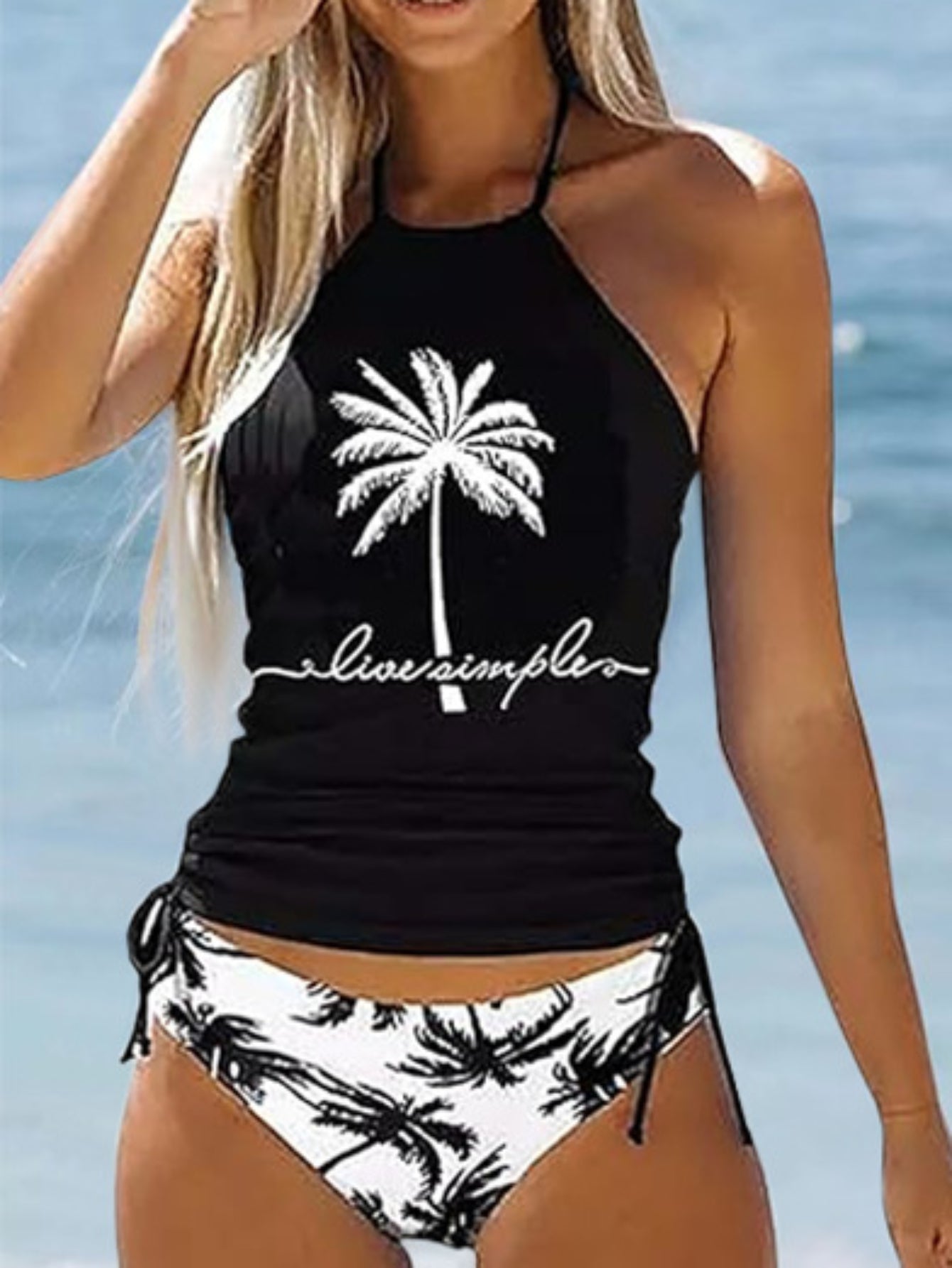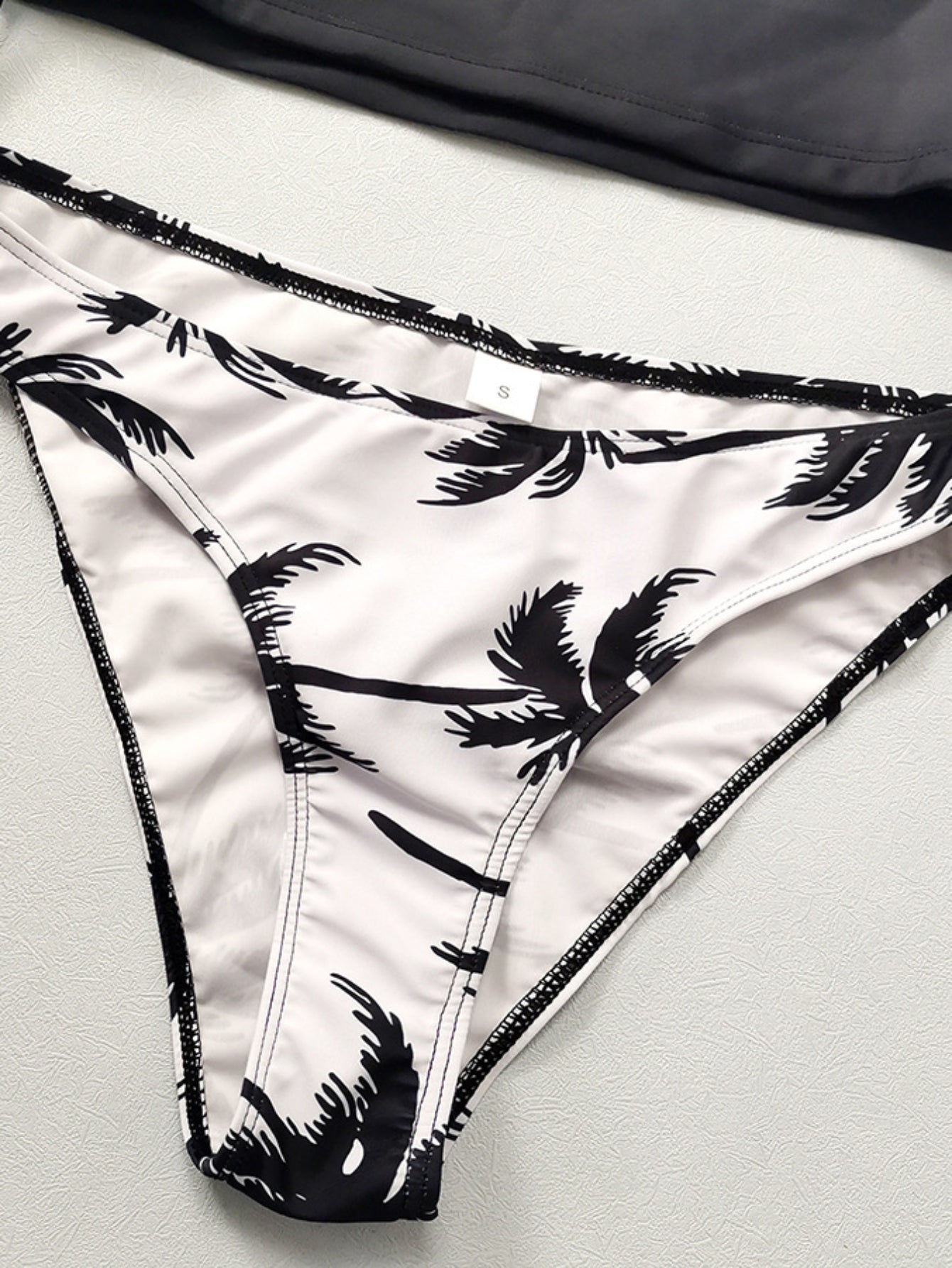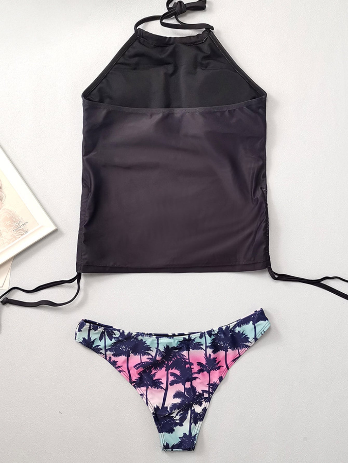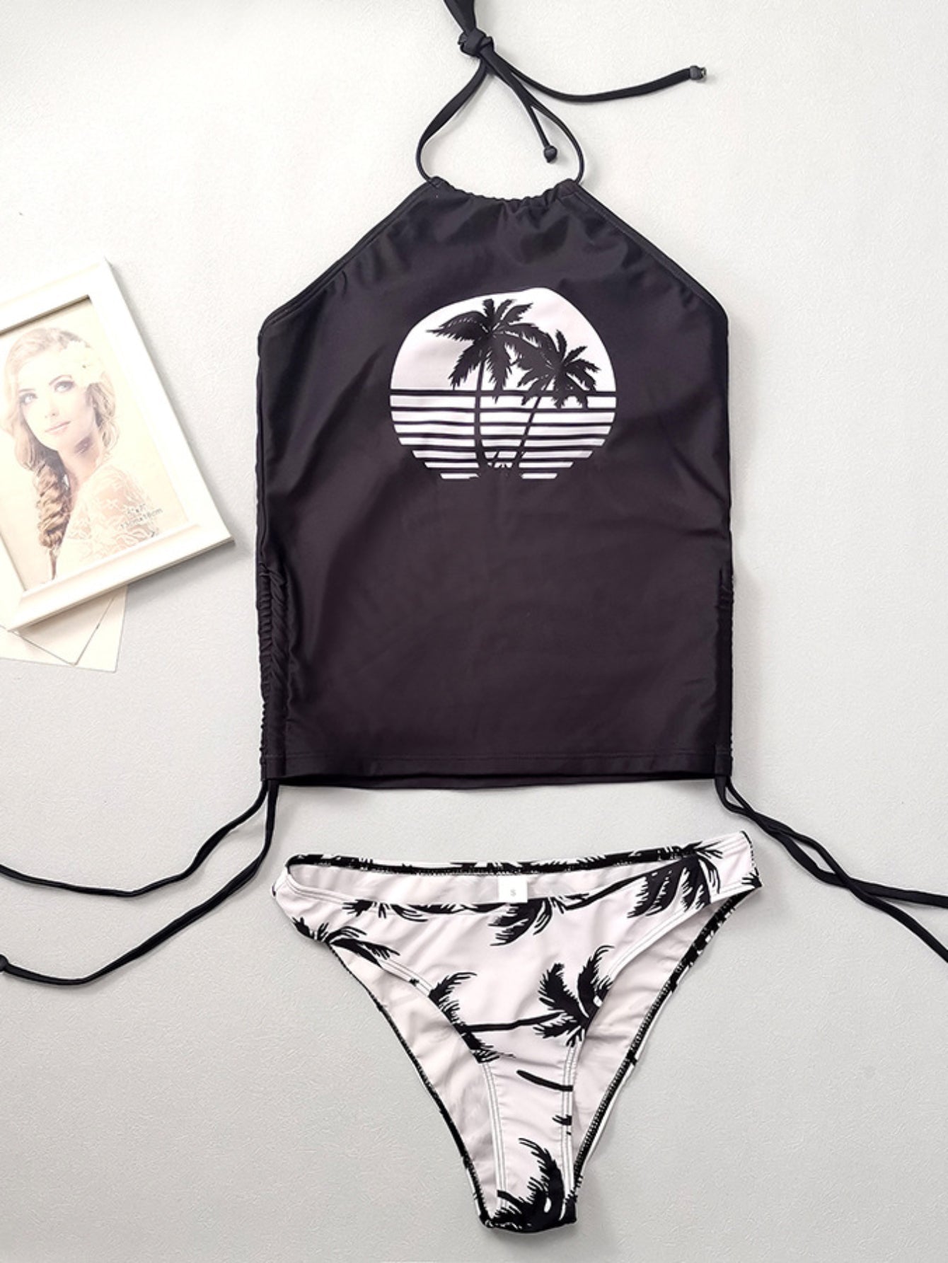 Sale 2pcs Elegant Black Tropical Print Stretchy Tankini Set - Ruched Sleeveless Top