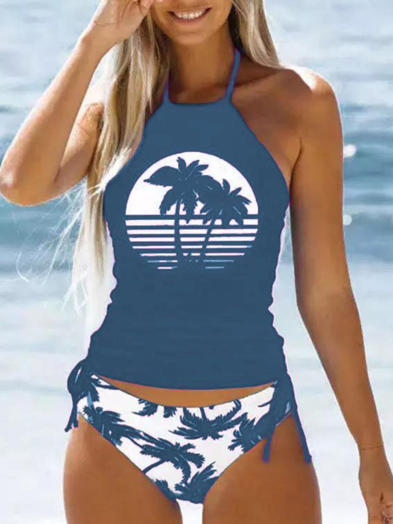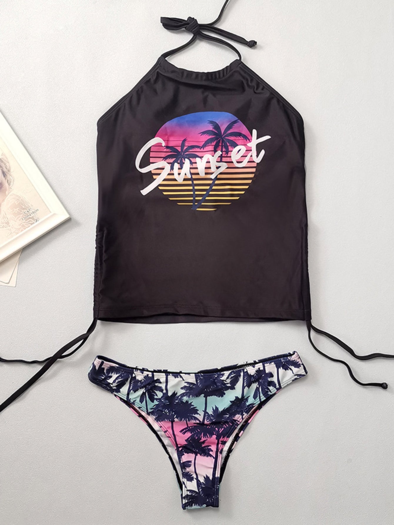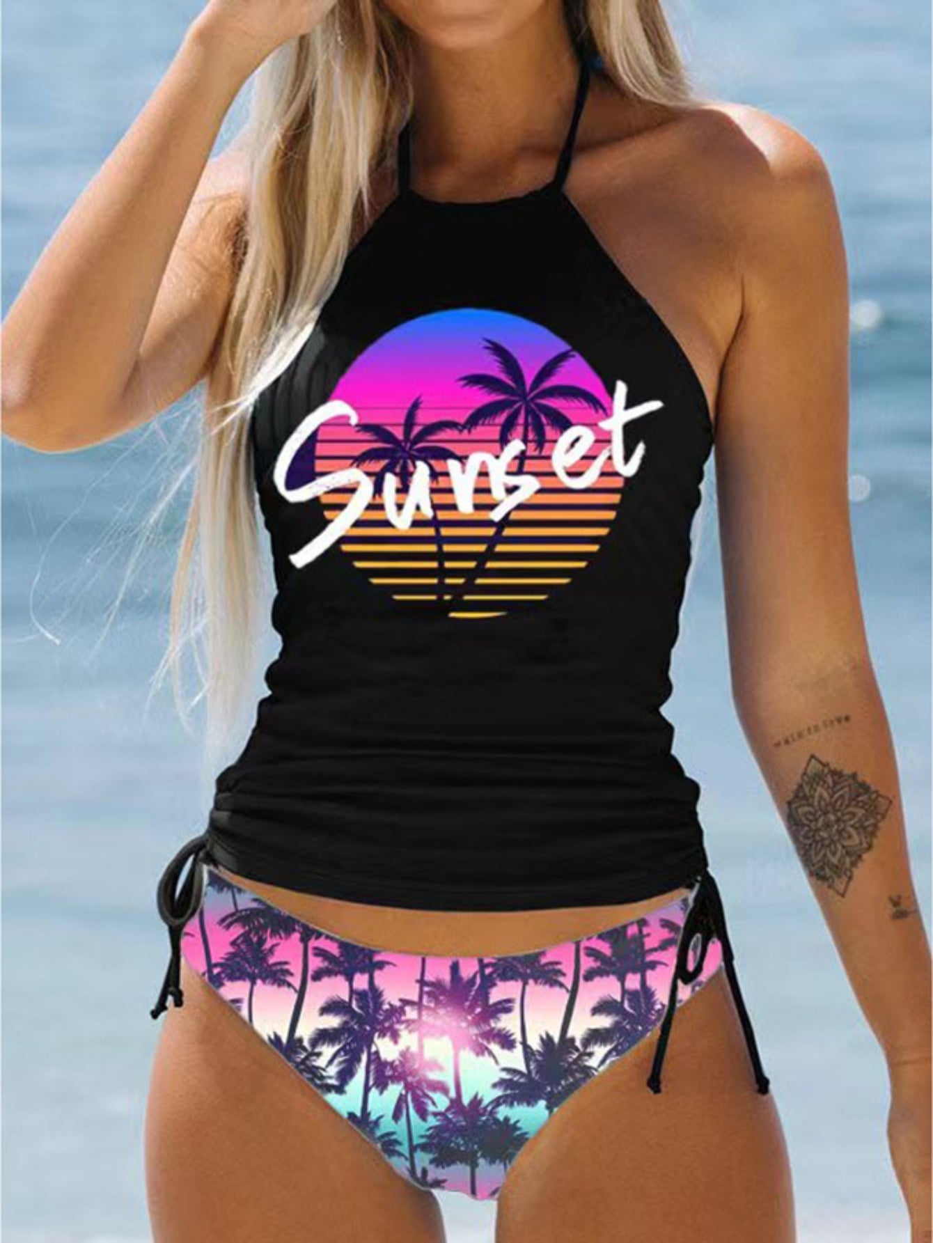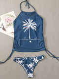 Sale Coconut Tree Sunset Pattern Drawstring 2 Piece Set Swimsuit, Halter Tie Neck Backless Stretchy Low Waist Bathing Suit