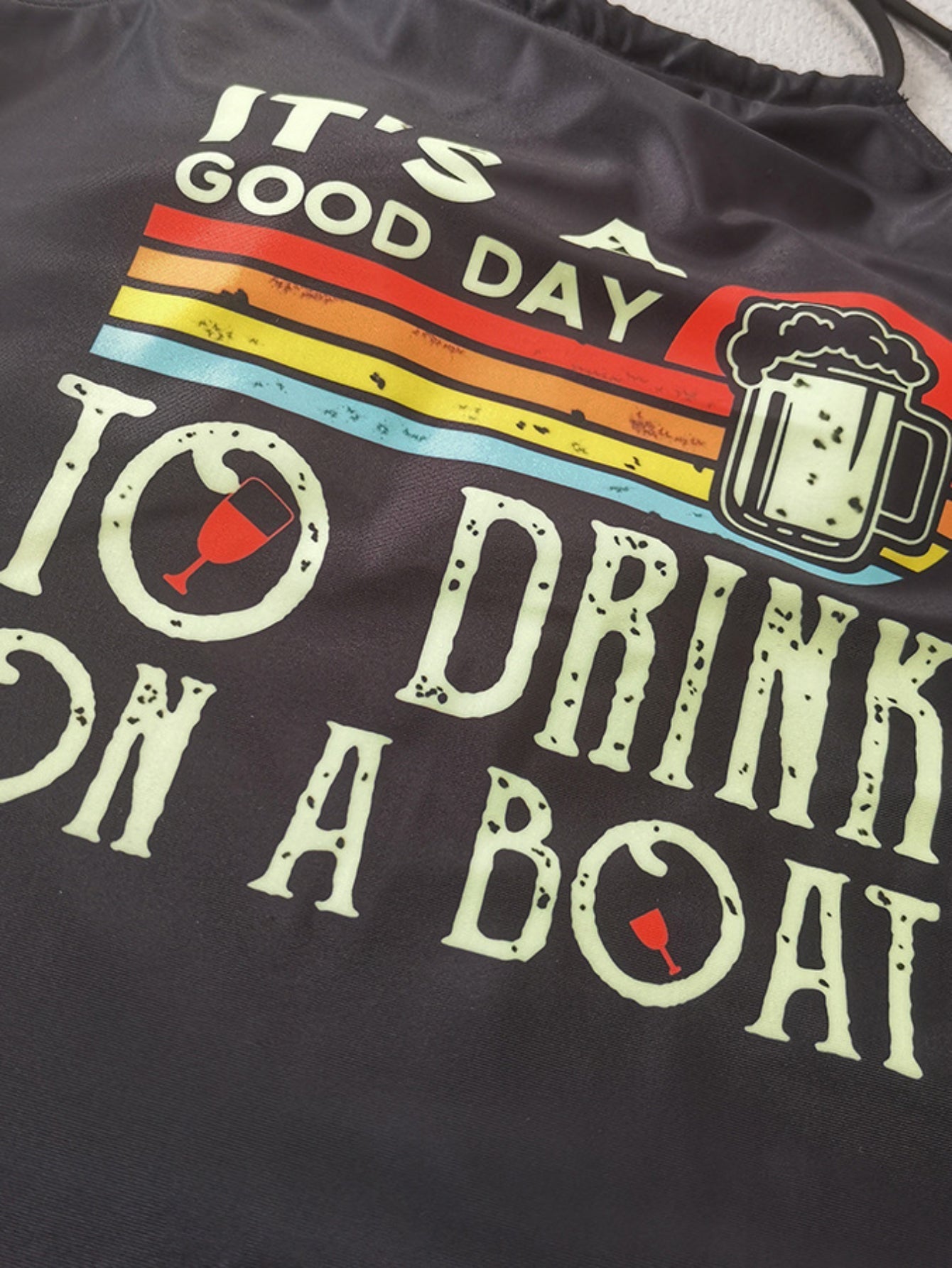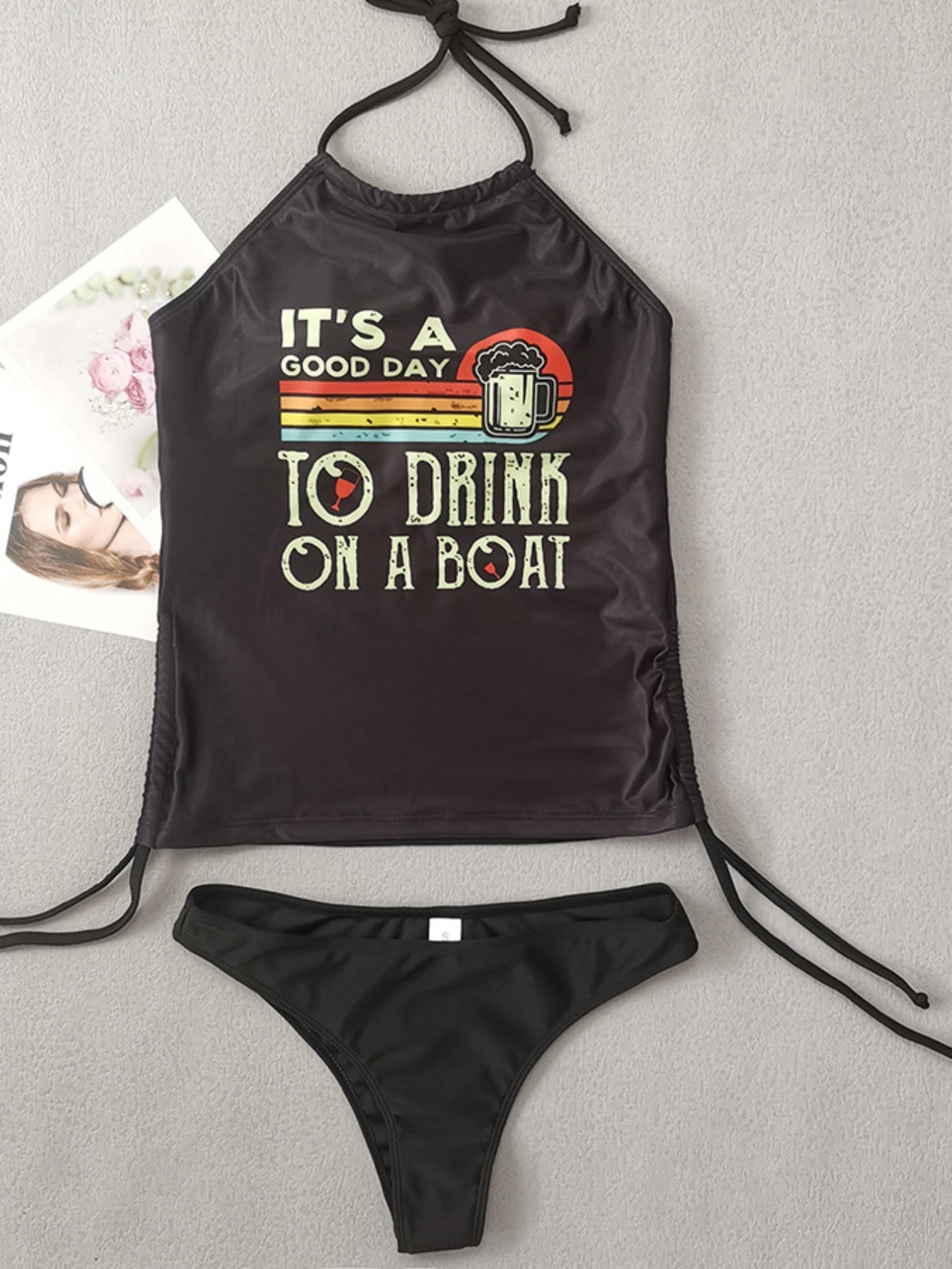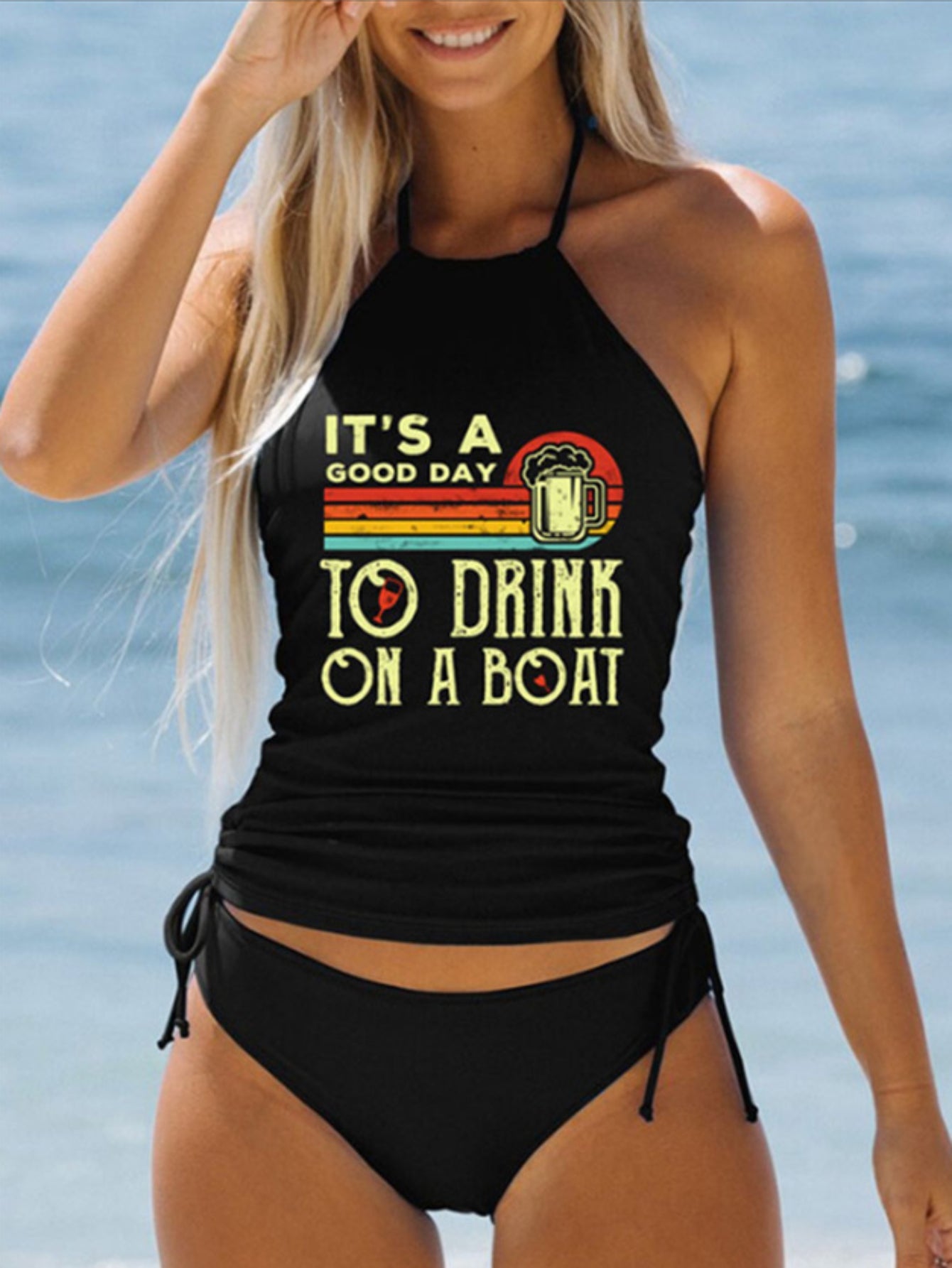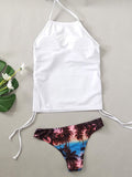 Sale Coconut Tree Sunset Pattern Drawstring 2 Piece Set Swimsuit, Halter Tie Neck Backless Stretchy Low Waist Bathing Suit