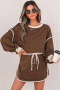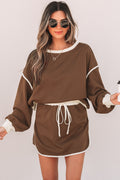 Coffee Color Contrast Loose Pullover and Lace-up Waist Skort Set