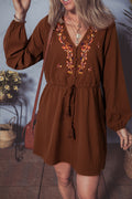 Coffee Floral Embroidered Tassel Tie Waist Long Sleeve Mini Dress