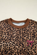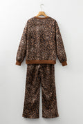 Coffee Leopard Print Contrast Trim Long Sleeve Top and Pants Set