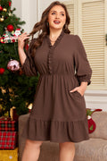 Coffee Plus Size Frilled Trim V Neck Puff Sleeve Textured Mini Dress