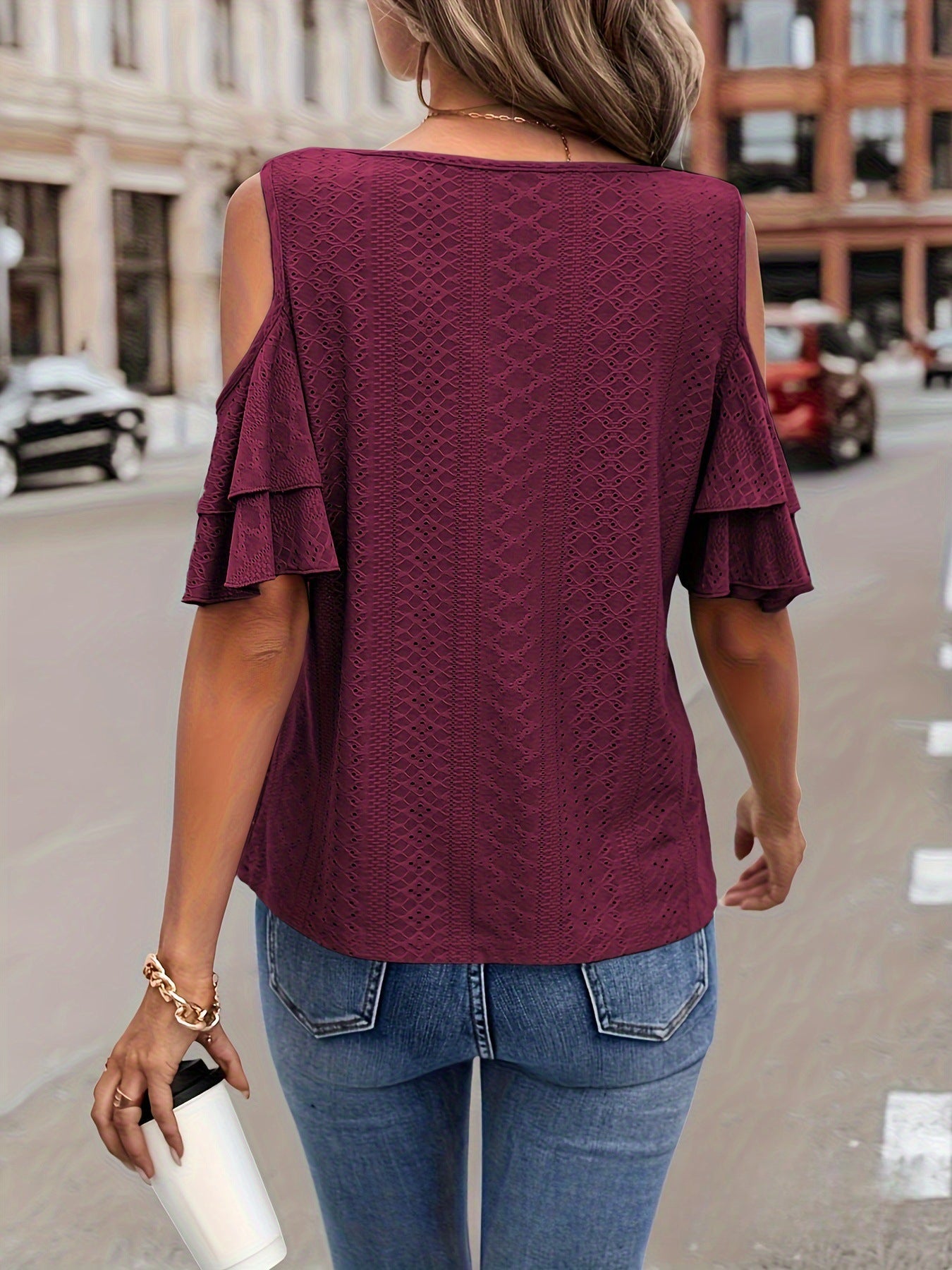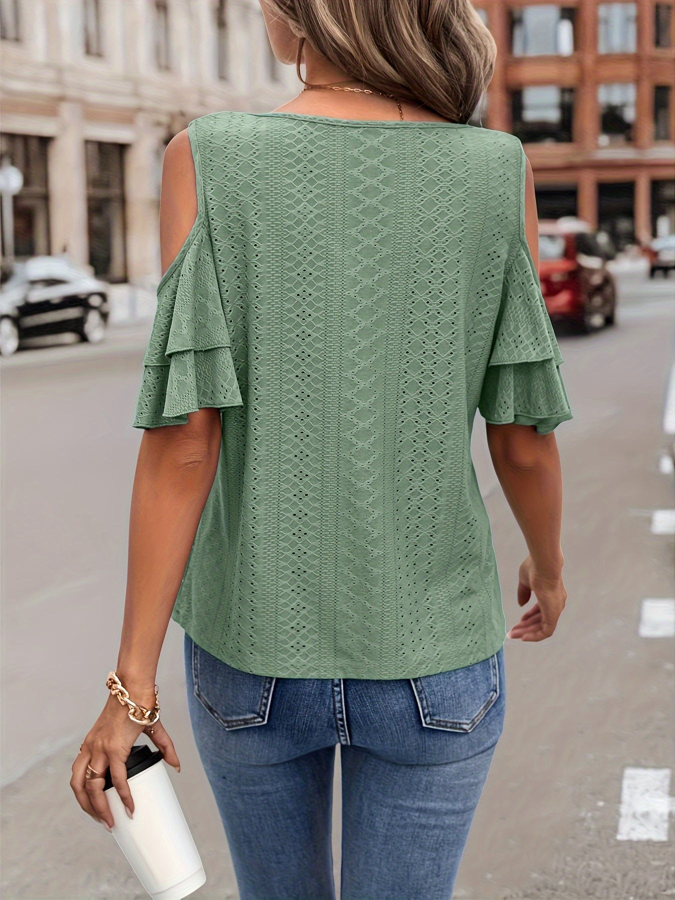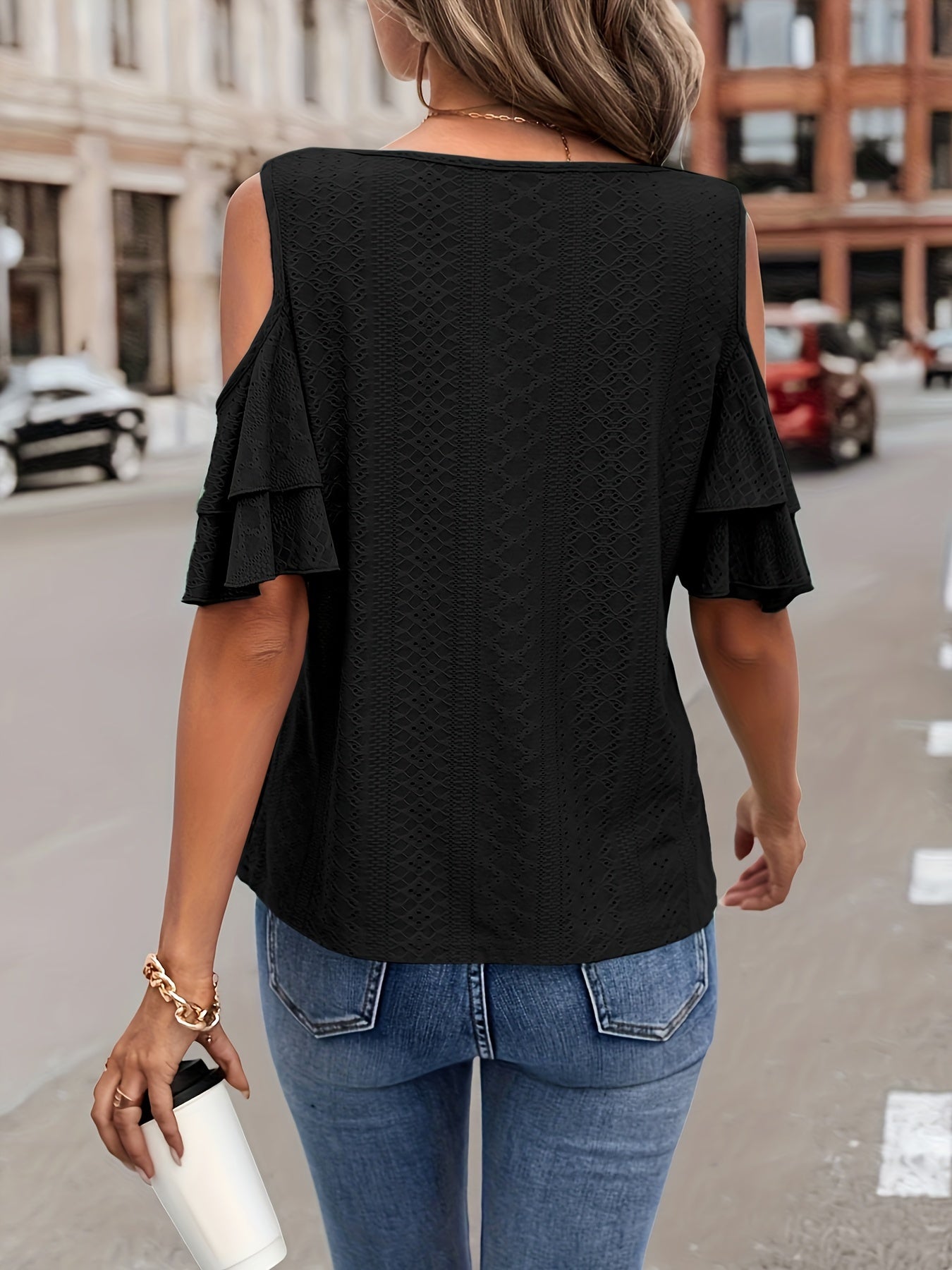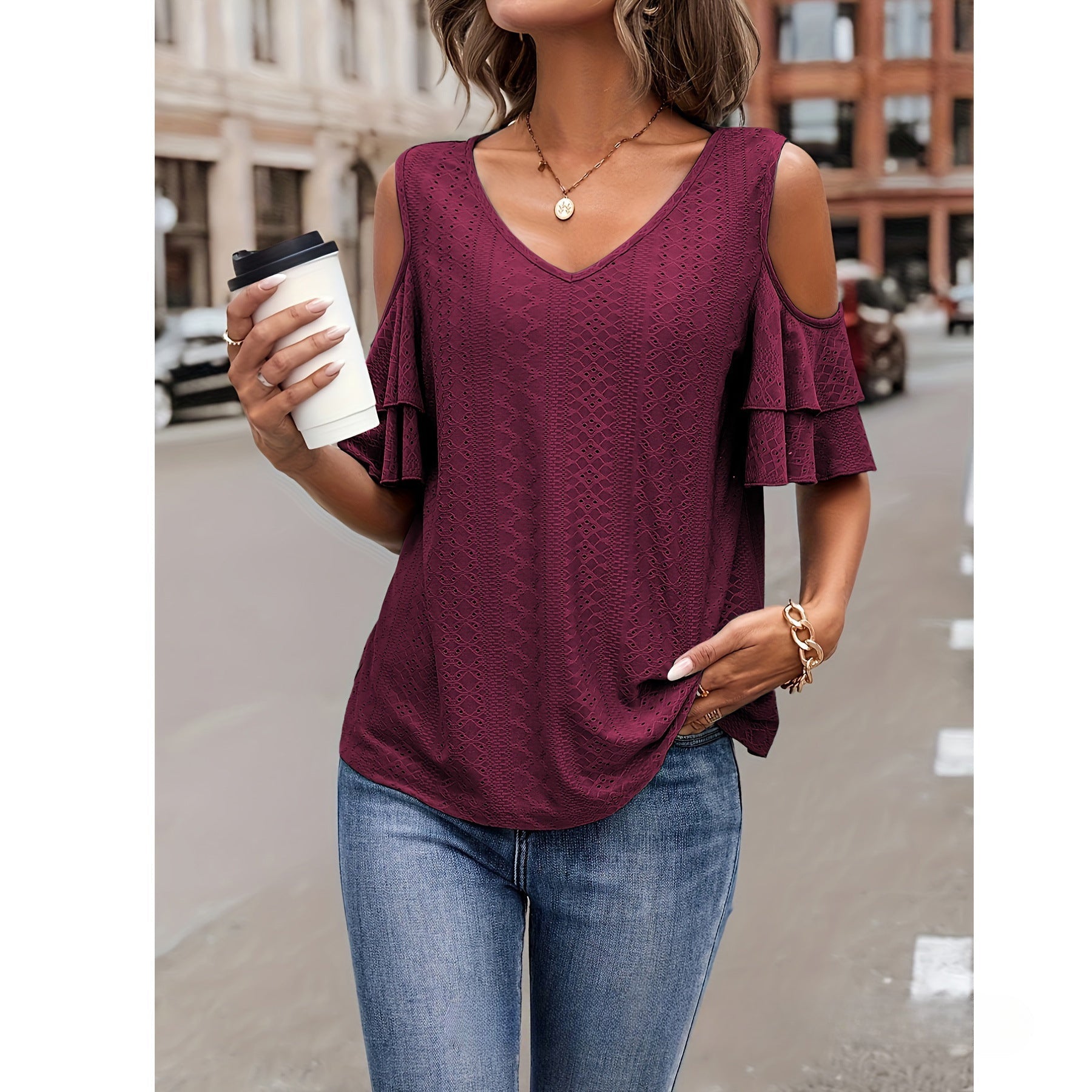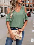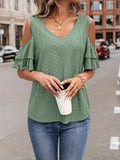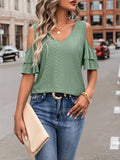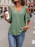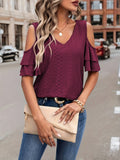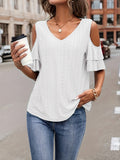 Sale Cold Shoulder V Neck Eyelet T-Shirt, Casual Flutter Tiered Sleeve T-Shirt