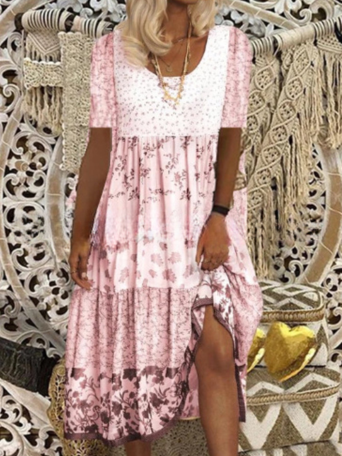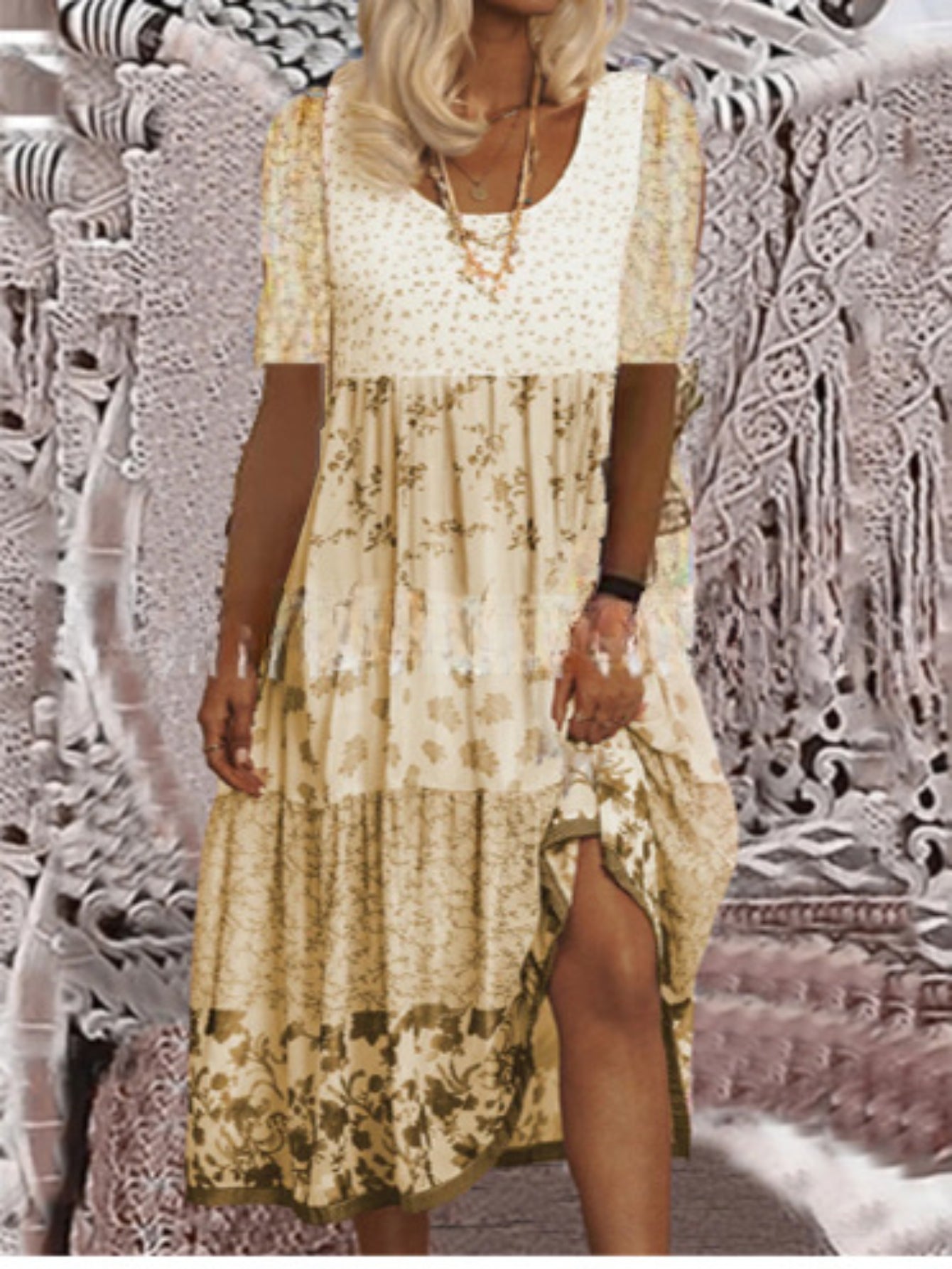 Colorblock Floral Print Dress - Comfortable and Stylish Short Sleeve High Stretch Dress