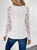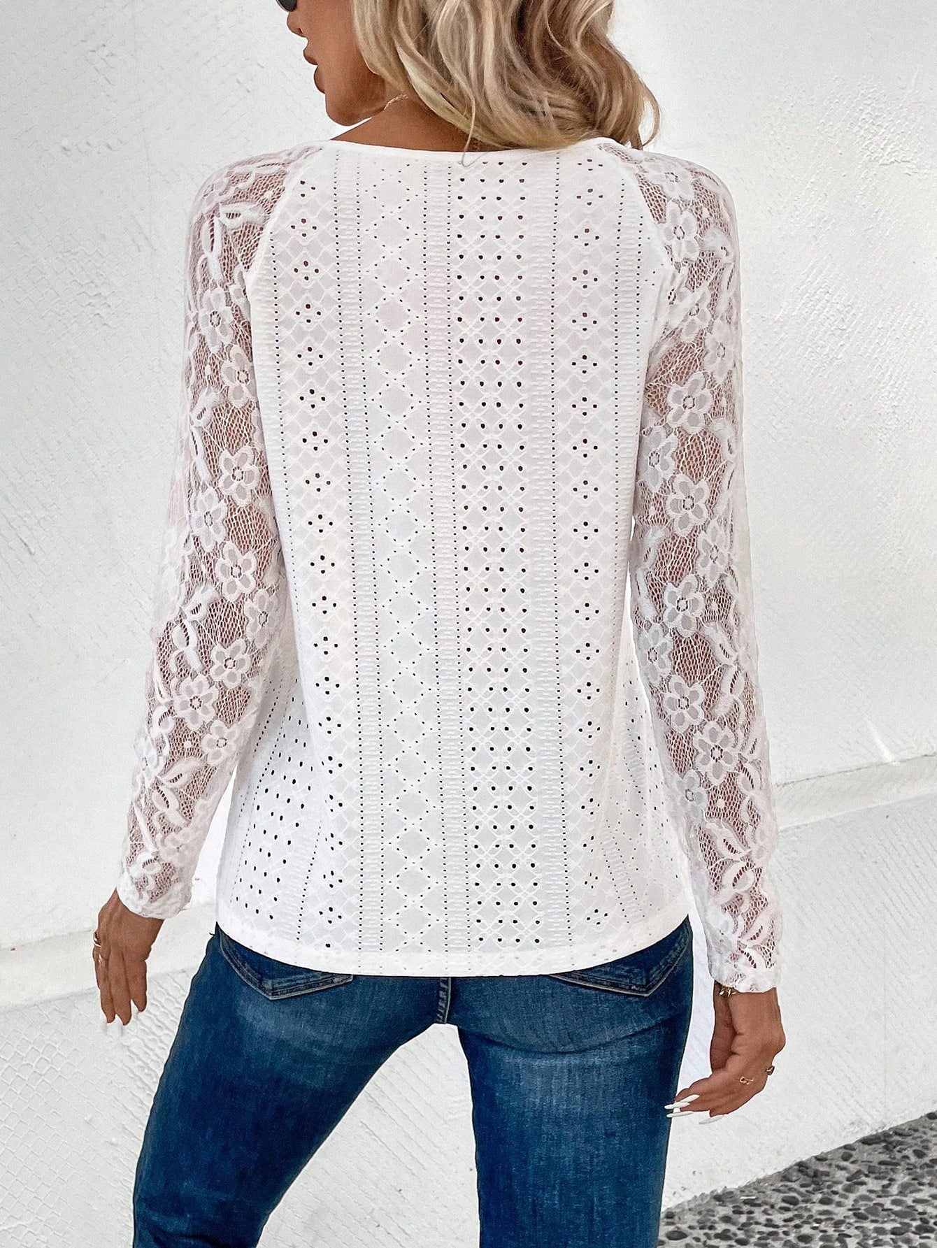 Contrast Lace V-neck Eyelet T-Shirt, Elegant Long Sleeve T-Shirt