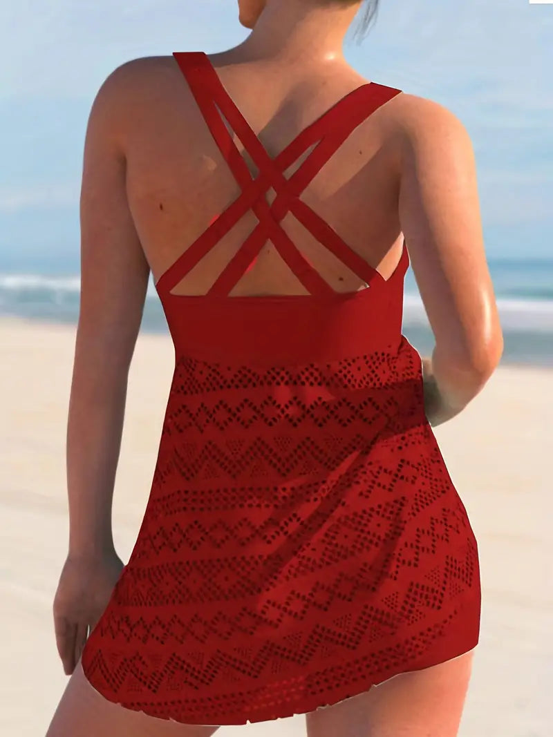 Contrast Mesh Tankini Sets, Drawstring Tie Front V Neck Solid Color Criss Cross Back With Boxer Short Bottom 2 Pieces Swimsuit