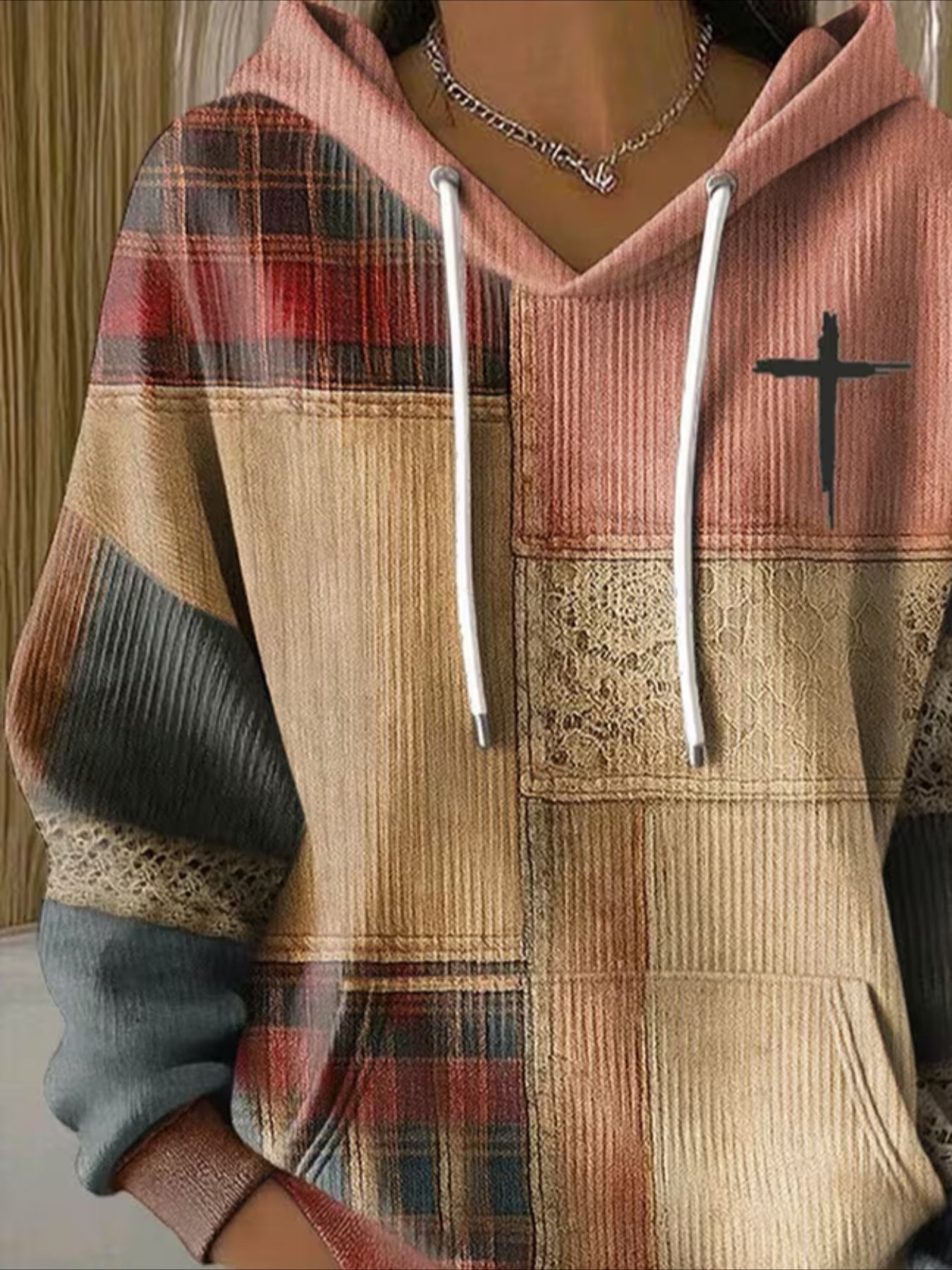 Colorful Ribbed V Neck Braided Print Long Sleeve Regular Sweatshirt