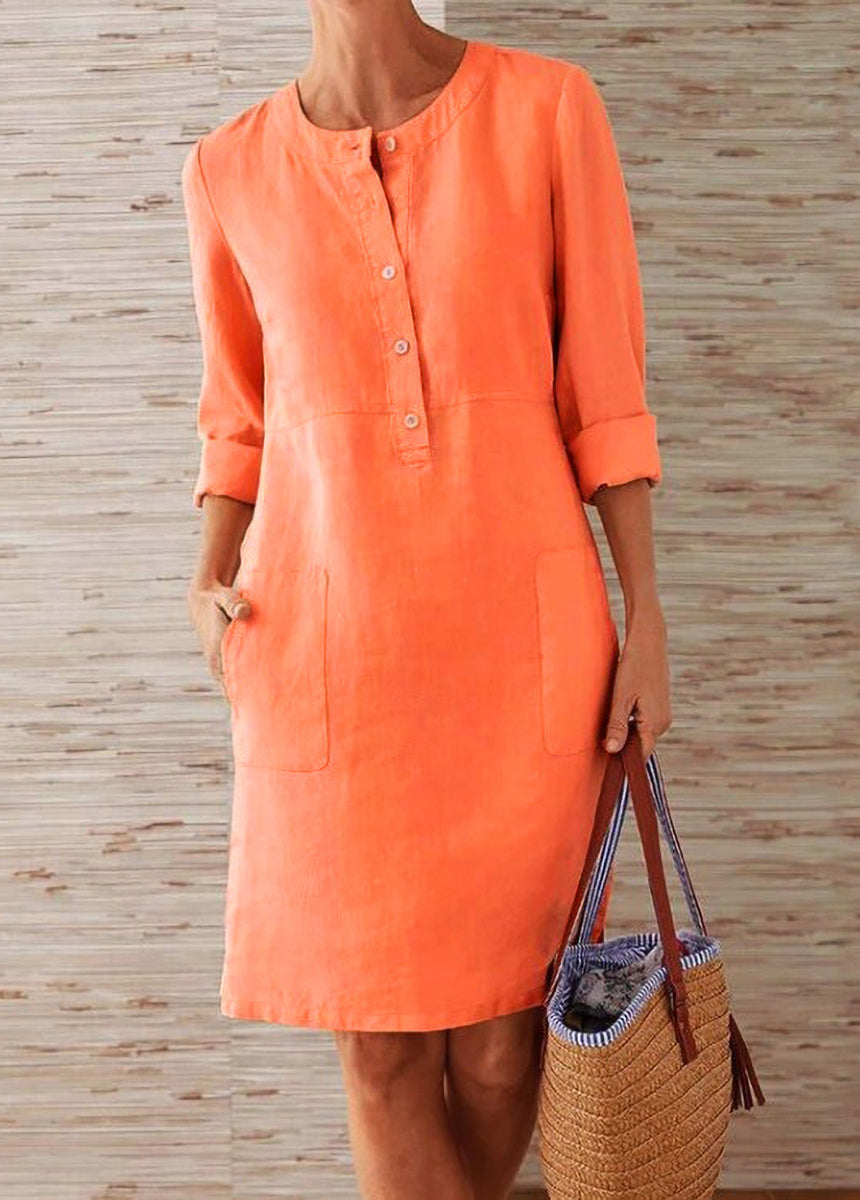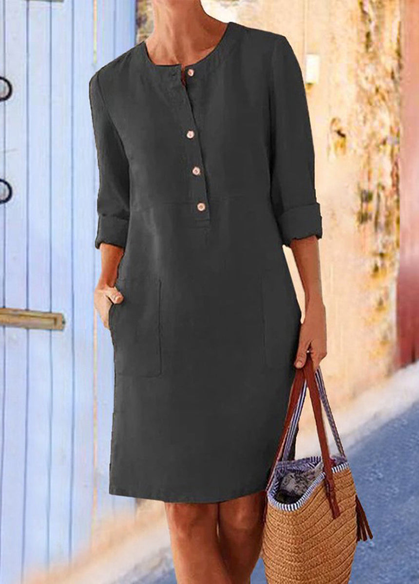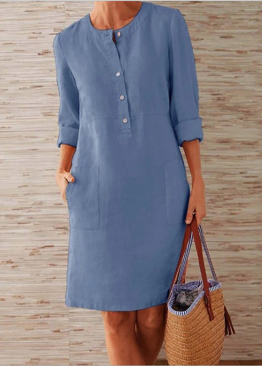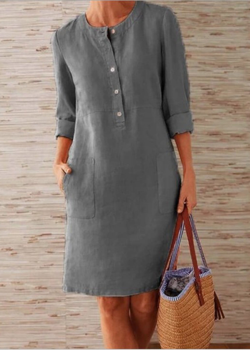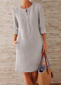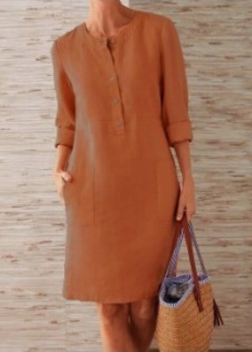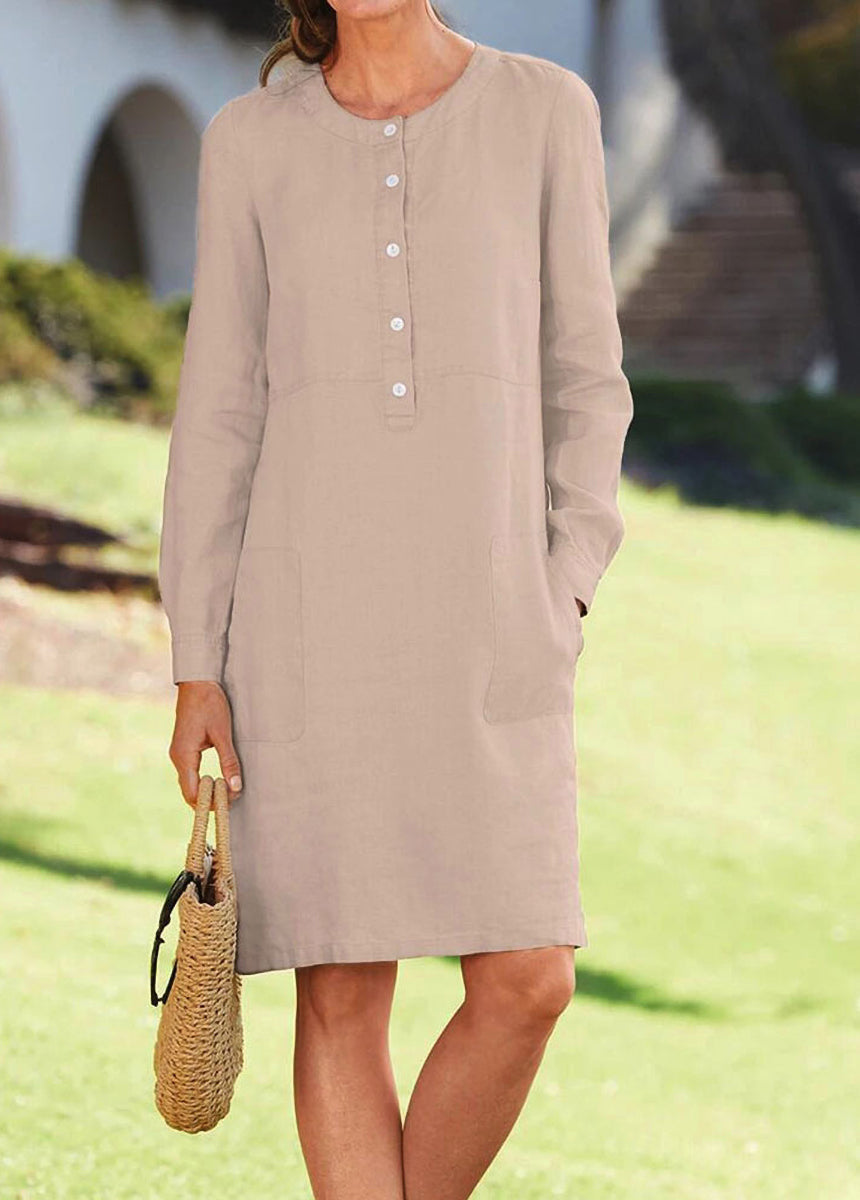 Cotton And Linen Round Neck Long-Sleeved Dress