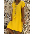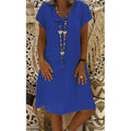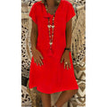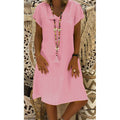 Cotton Linen Solid Loose V Neck Short Sleeve Midi Dress