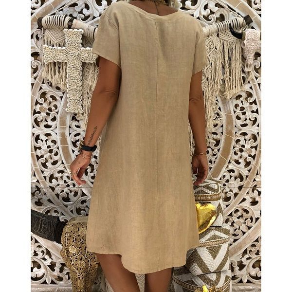 Sale Cotton Linen Solid Loose V Neck Short Sleeve Midi Dress