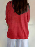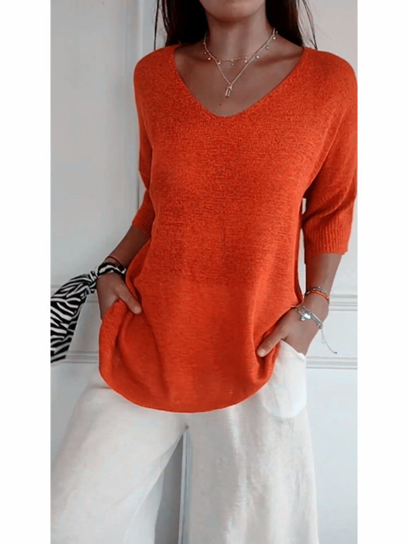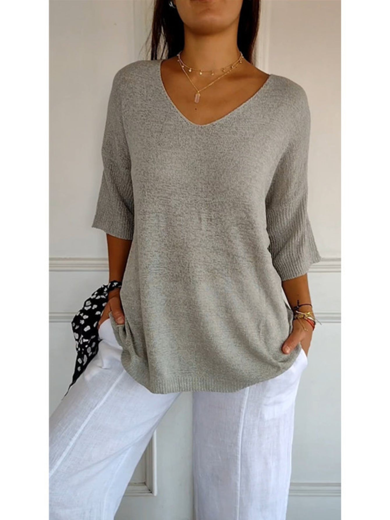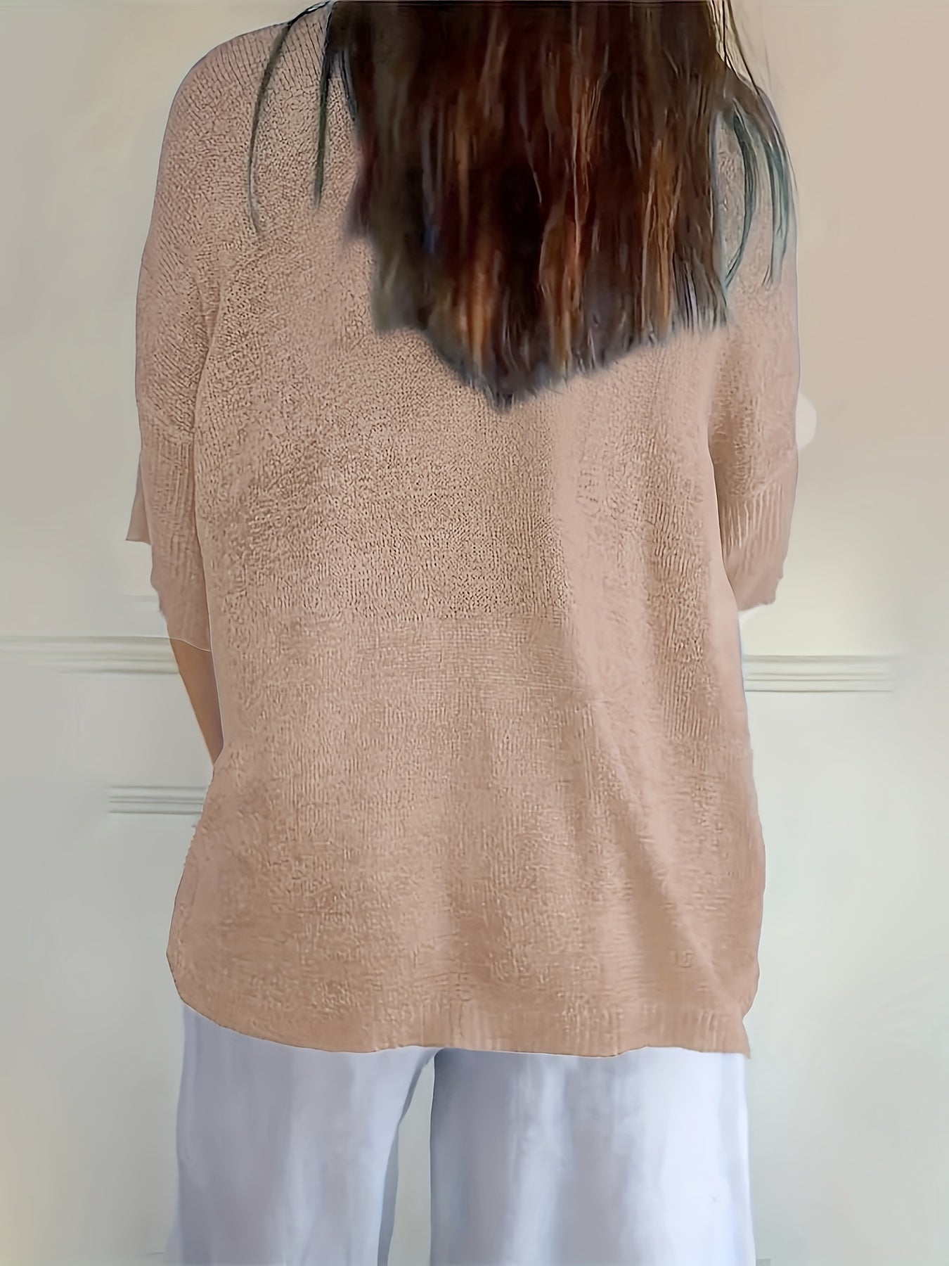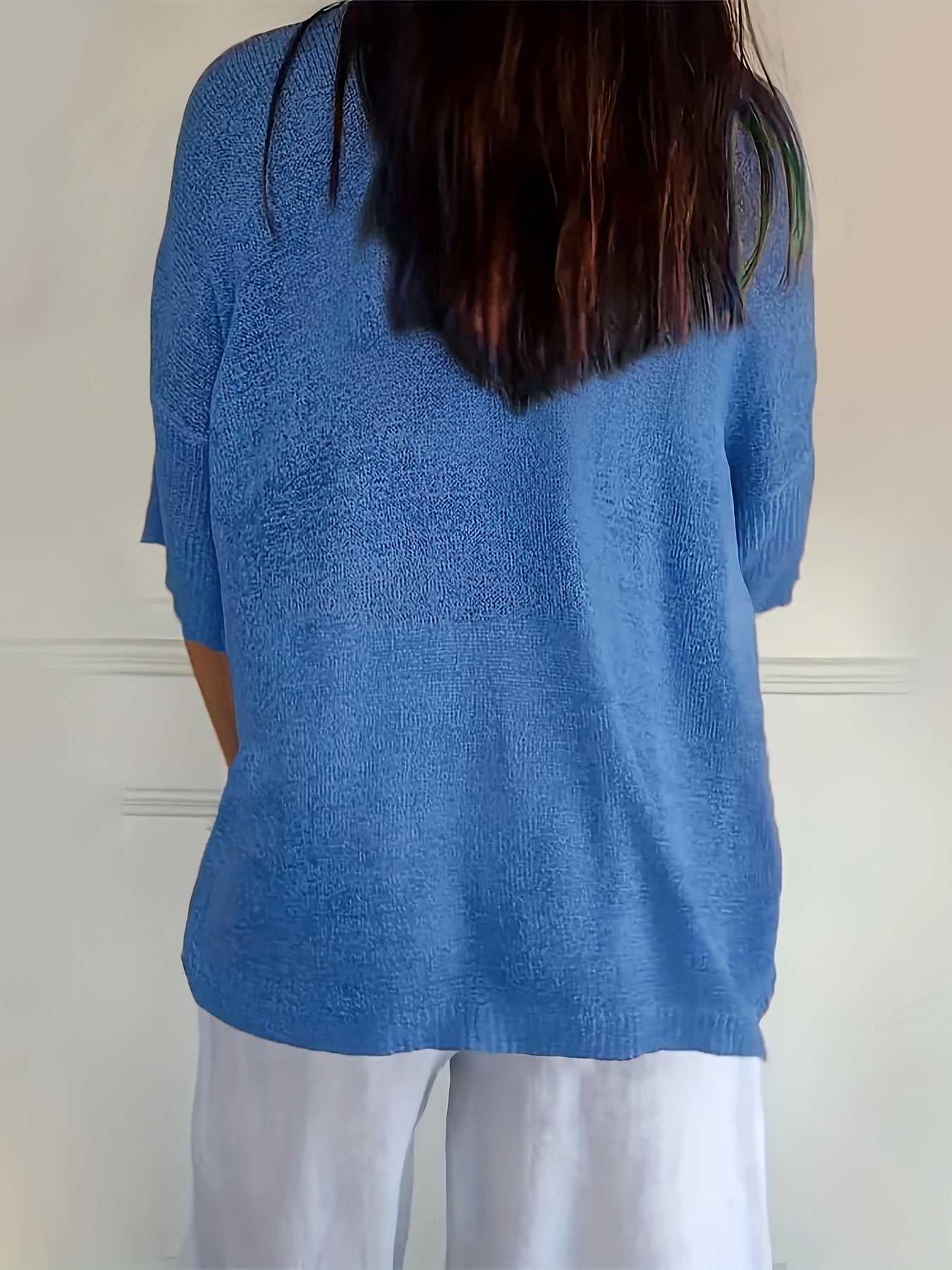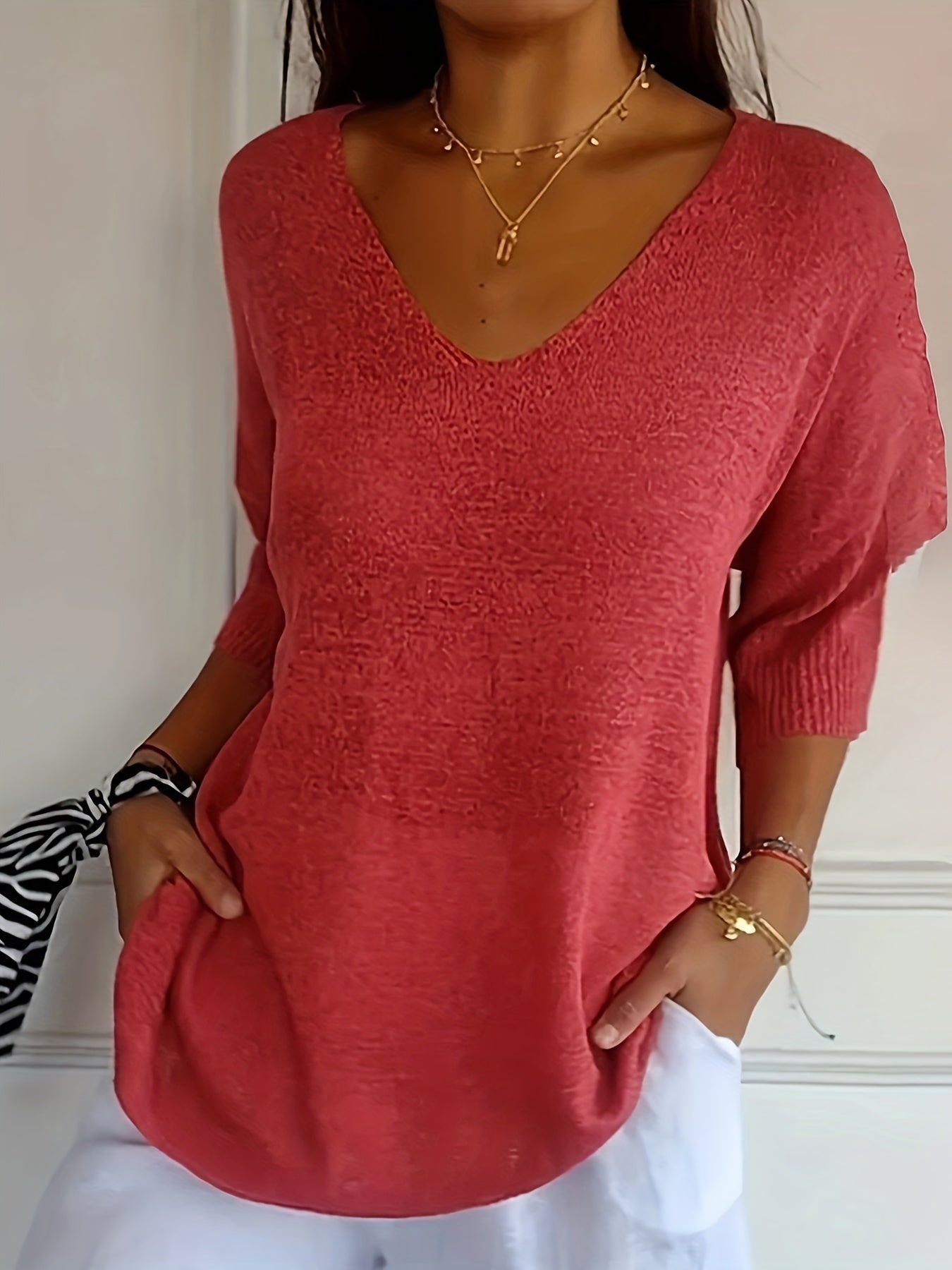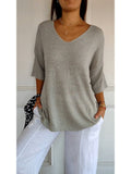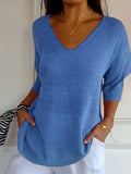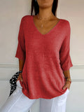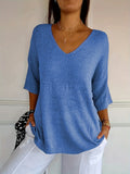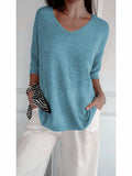 Cozy V Neck Pullover Three-Quarter Sleeve Knitted Sweater
