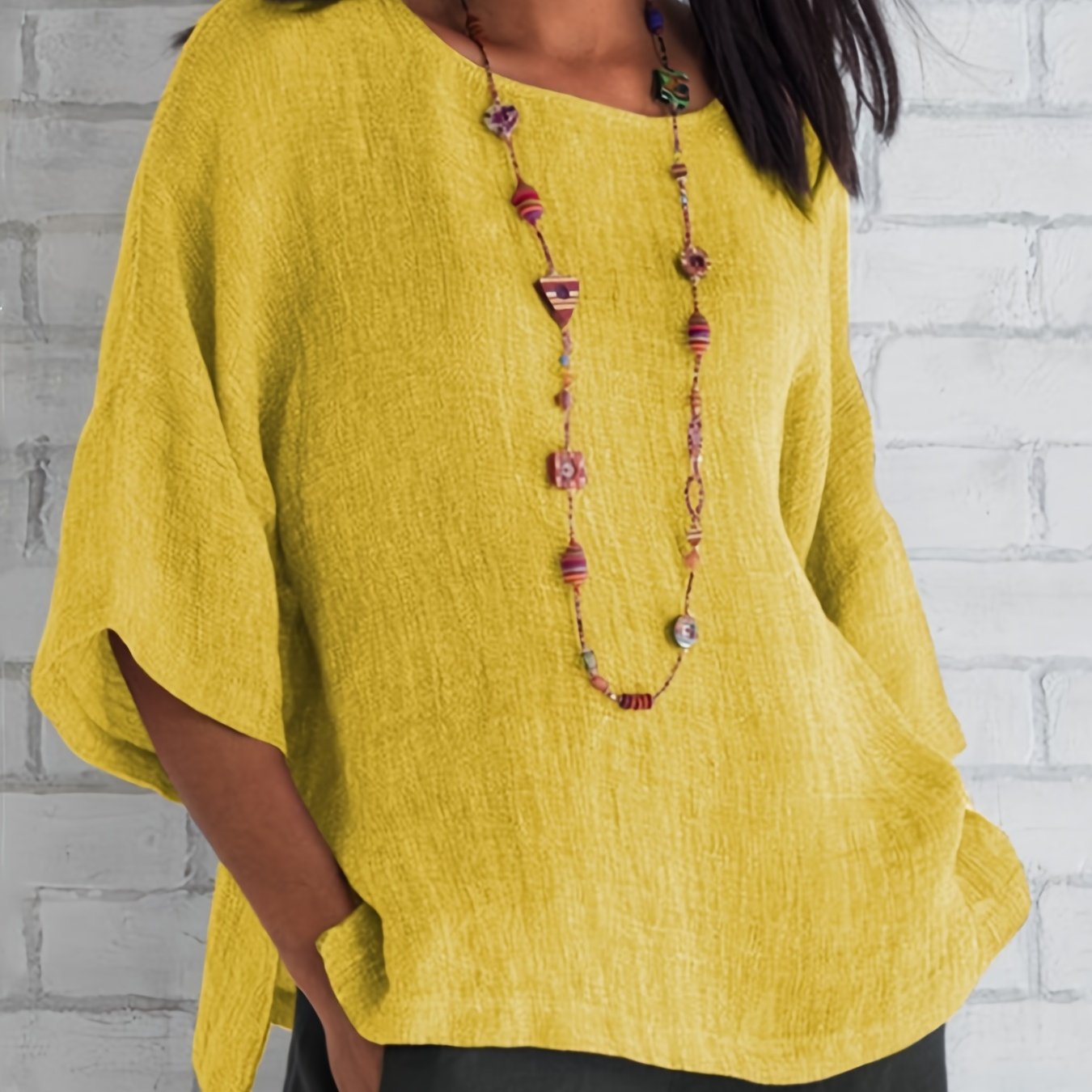 Crew Neck Loose Blouses, Casual Solid Color 3/4 Sleeve Summer Shirts Tops