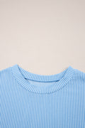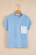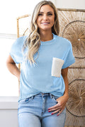 Dark Blue Corded Knit Color Block Pocketed Crew Neck T Shirt