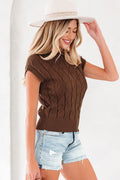 Dark Brown Cable Texture Crew Neck Short Sleeve Sweater Top