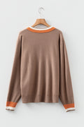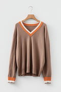 Dark Khaki Contrast Striped Trim V Neck Varsity Sweater