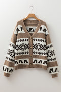 Dark Khaki Ethnic Geometric Pattern Button Front V Neck Sweater Cardigan