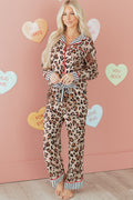 Dear Lover Khaki Leopard Print Colorblock Striped Edge Shirt and Pants Pajama Set